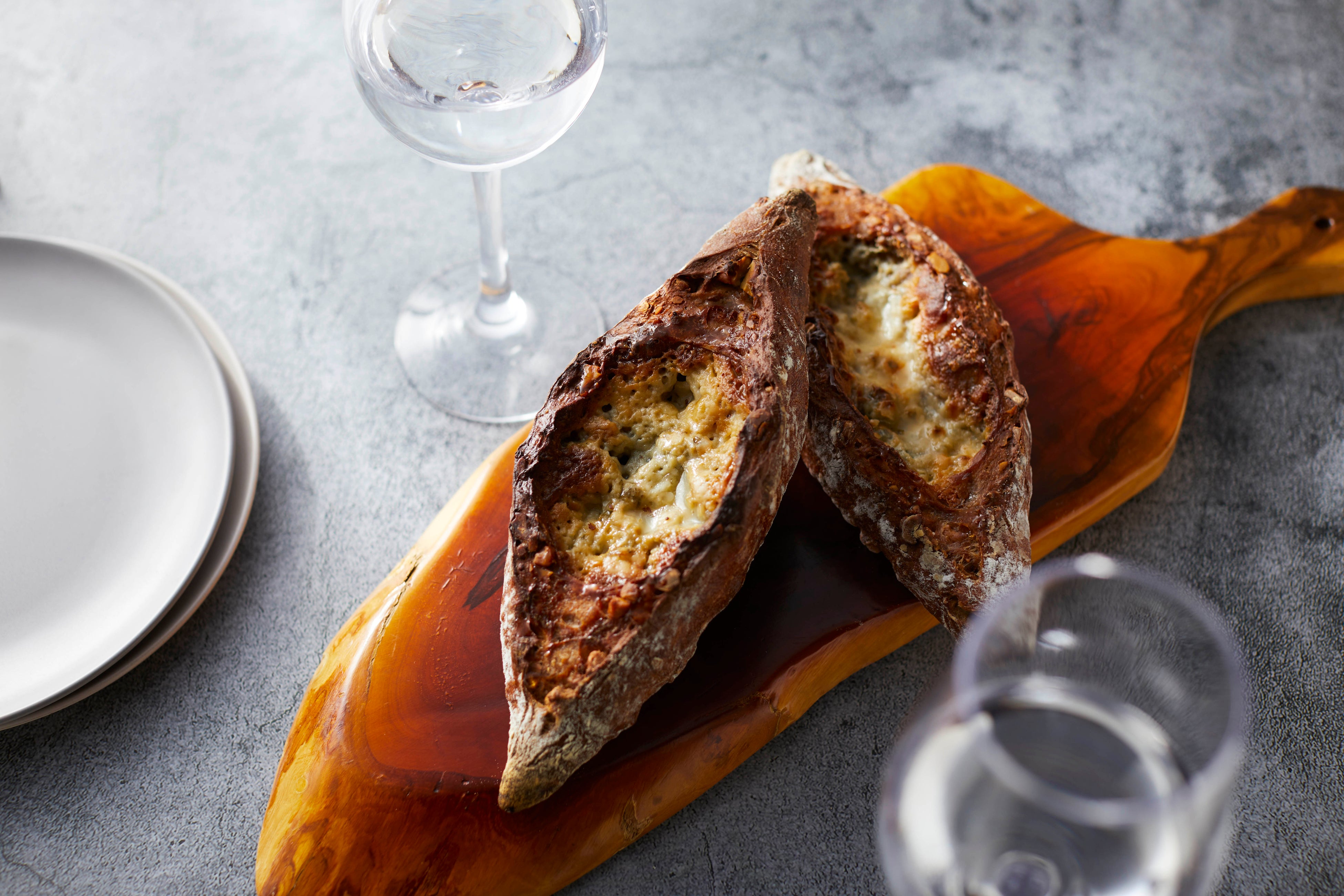 低温で一晩かけてじっくり発酵した小麦の風味が豊かなレトロバケットの生地に、ダナブルー(ブルーチーズ)を包んで焼き上げ、蜂蜜を組み合わせました。ダナブルー特有のシャープな味わいと塩味に蜂蜜をかけたあまじょっぱさがやみつきになるバケットです。