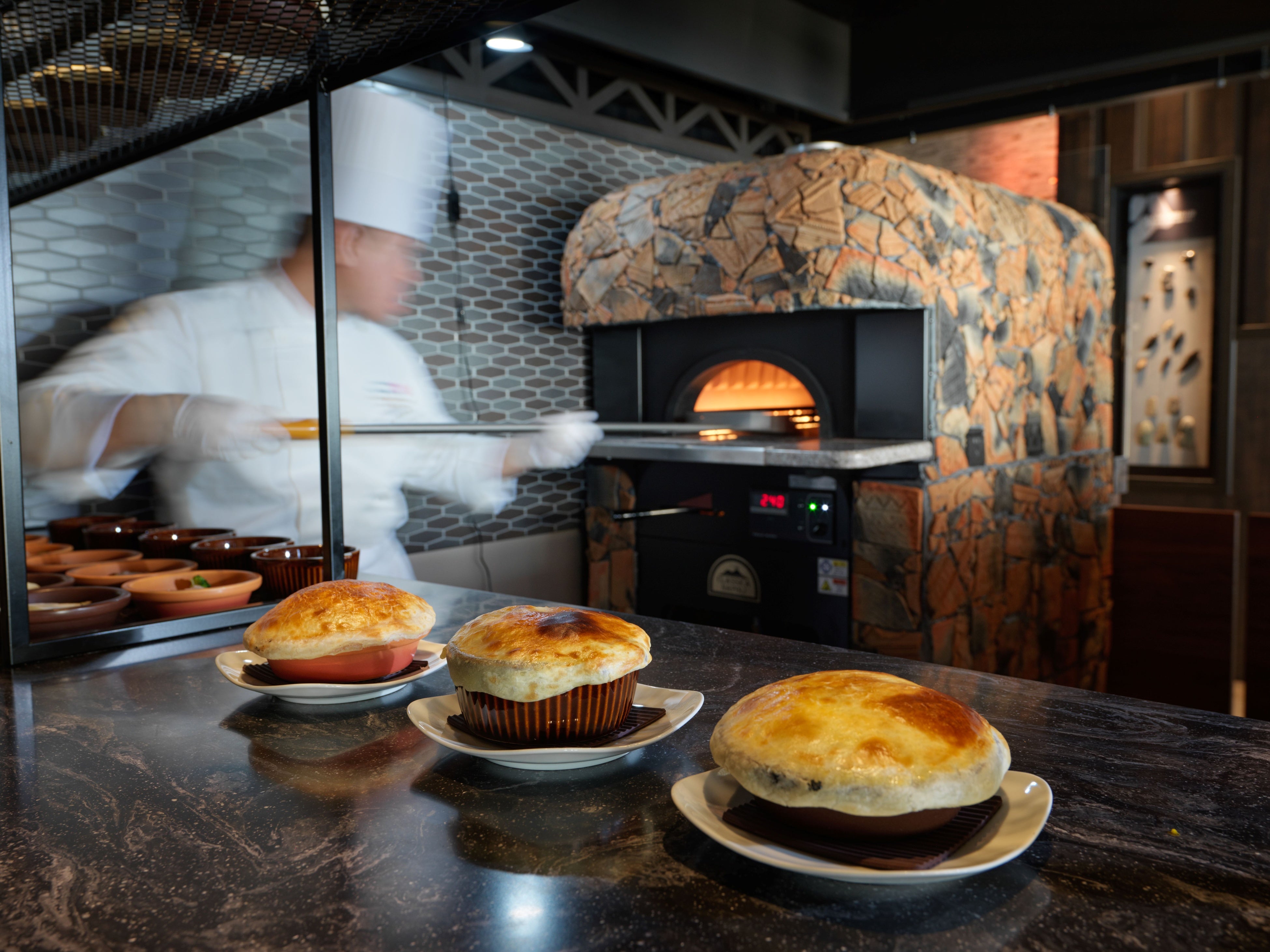 昨年6月にホテル近隣に位置する「常呂遺跡の森」所蔵の「常呂川河口遺跡墓坑出土品」が国の重要文化財に認定されたことをモチーフに、歴史・文化にちなんだデザインがリニューアルのコンセプトになりました。その一環として、新たに古代の窯をイメージしたオーブンを設置。レプリカの土器を割り、一枚一枚丁寧に貼り付けたオーブンが完成しました。葉っぱで包み蒸し焼きにして食していたであろう古代の食文化をイメージし、近郊の魚介等をパイで包んだ「包み焼き料理」をご提供いたします。