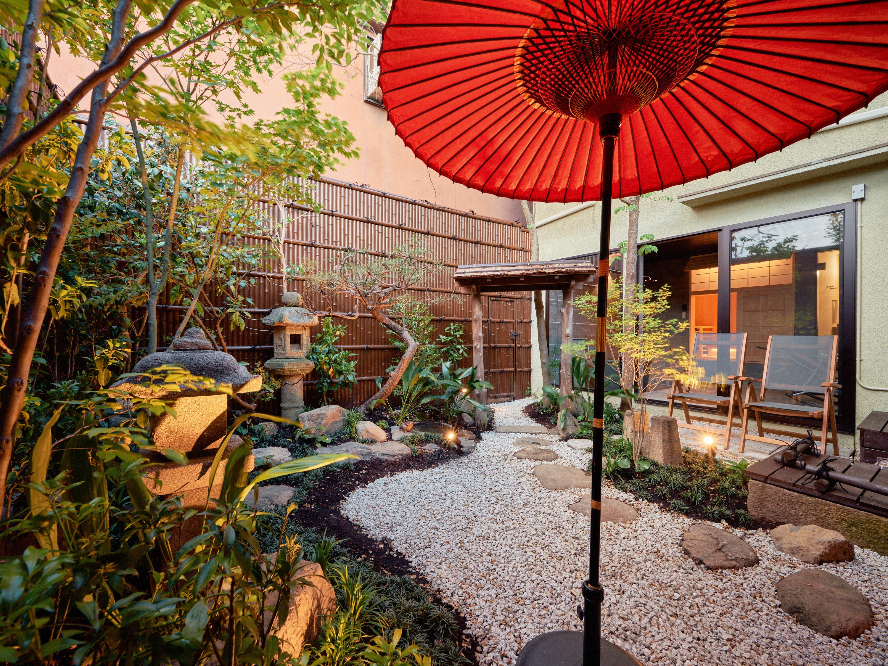 今昔荘は、古い建物をリノベーションし、その土地の歴史をコンセプトにしてデザインされた貸切宿です。大阪府外初店舗となる「今昔荘 奈良 ならまち 蒸⾵呂邸」は完全貸切、男⼥での利⽤が可能な個室サウナと半露天⾵呂を備えております。寝室は4室、ベッドは8台あり、地酒『春⿅』 を中⼼とした飲み物や必要な設備をすべて料⾦内でご⽤意しております。