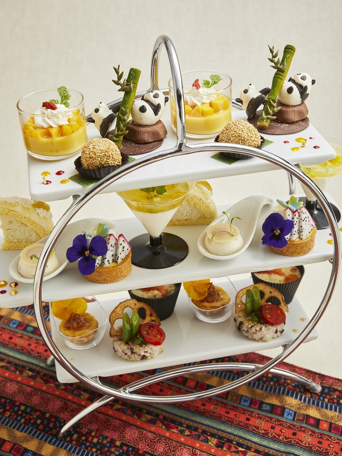 美味しい現地グルメを満喫することは旅行の醍醐味の一つ。7月の「フォンテーヌ」では、アジア諸国を旅するようにスイーツやセイボリーをお楽しみいただける「アジアンアフタヌーンティー」を初めてご提供いたします。コロンとしたフォルムが愛らしいパンダのチョコレート細工や、爽やかな味わいのバタフライピーとパッションフルーツのウェルカムドリンクがアフタヌーンティーの始まりを告げます。シークワーサーのジュレでさっぱりと味わえる杏仁豆腐のグラスデザートや、クリームチーズを加えた生クリームのコクとあっさりとしたドラゴンフルーツが美味しいタルト、濃厚な果実の味をご堪能いただけるマンゴープリンなど、中国、タイ、香港のスイーツが並びます。