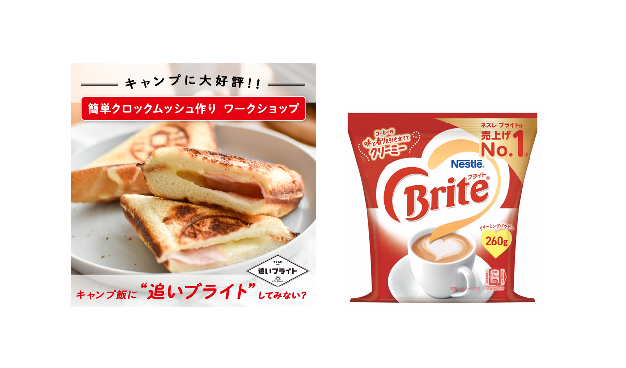 近年のキャンプブームでキャンプを楽しむ方が増えている一方で、キャンプ飯のマンネリ化に悩まれている方も増えています。そのような方にもお勧めしたい“追いブライト”のキャンプ飯を、今回のワークショップで提供します。パンにハムとチーズを挟み「ブライト」を振りかけて焼くだけのとても簡単に作ることのできるクロックムッシュで、ホワイトソースや牛乳を使うことなく「ブライト」でクリーミーな味わいに仕上げています(※1)。特に夏の炎天下では牛乳の持ち運びや鮮度管理に配慮が必要ですが、「ブライト」を使えば牛乳の準備は不要となり、夏でもクリーミーなメニューが楽しめます。東京にいながらにして、屋外の開放感あふれる新緑の中で自ら作って食べるというキャンプ気分を存分に体感できるワークショップです。