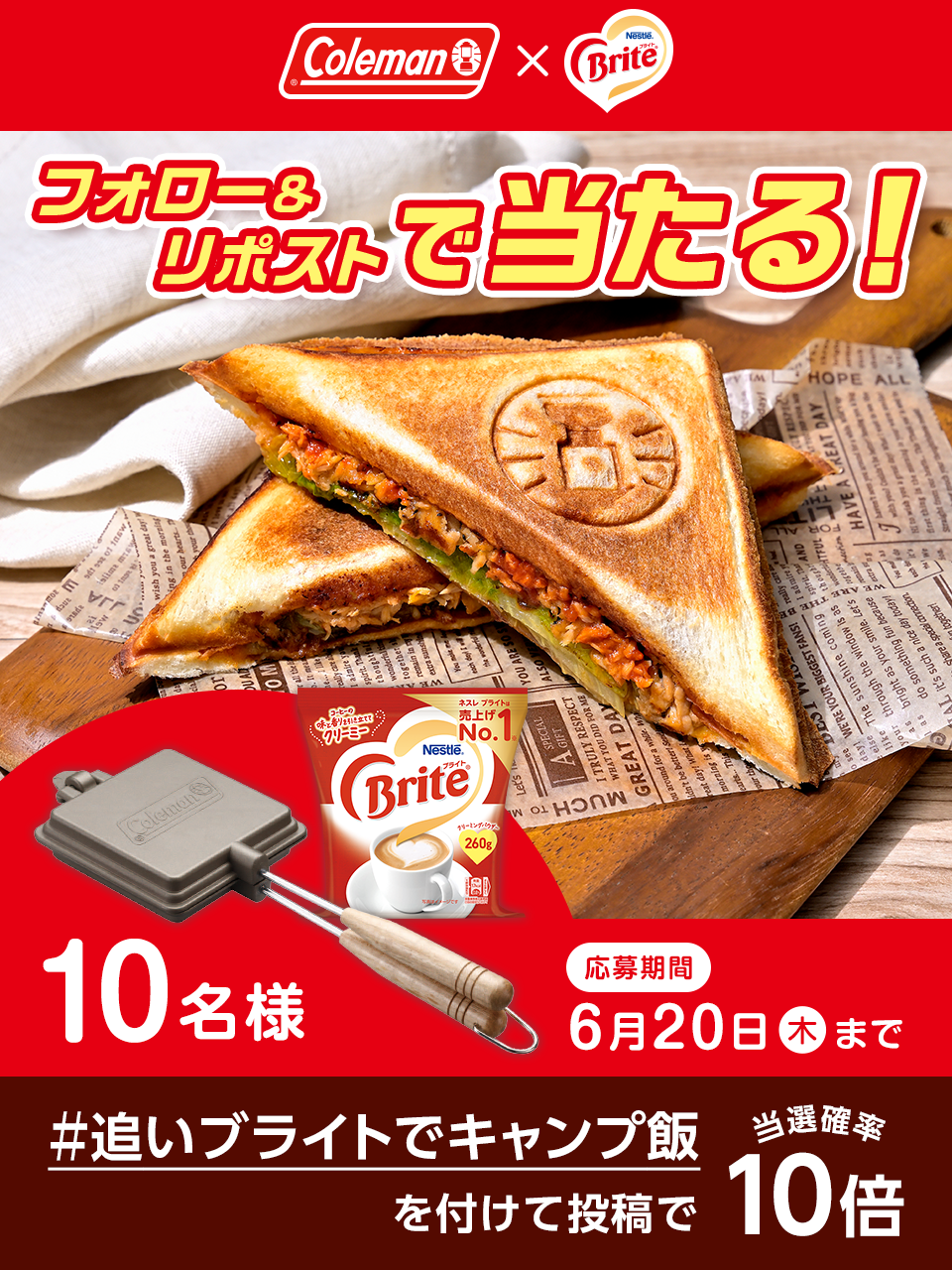 さらにキャンプやアウトドアで“追いブライト”キャンプ飯を楽しんでいただくために、「ブライト」とコールマン「ホットサンドイッチクッカー」が当たるXキャンペーンを実施します。