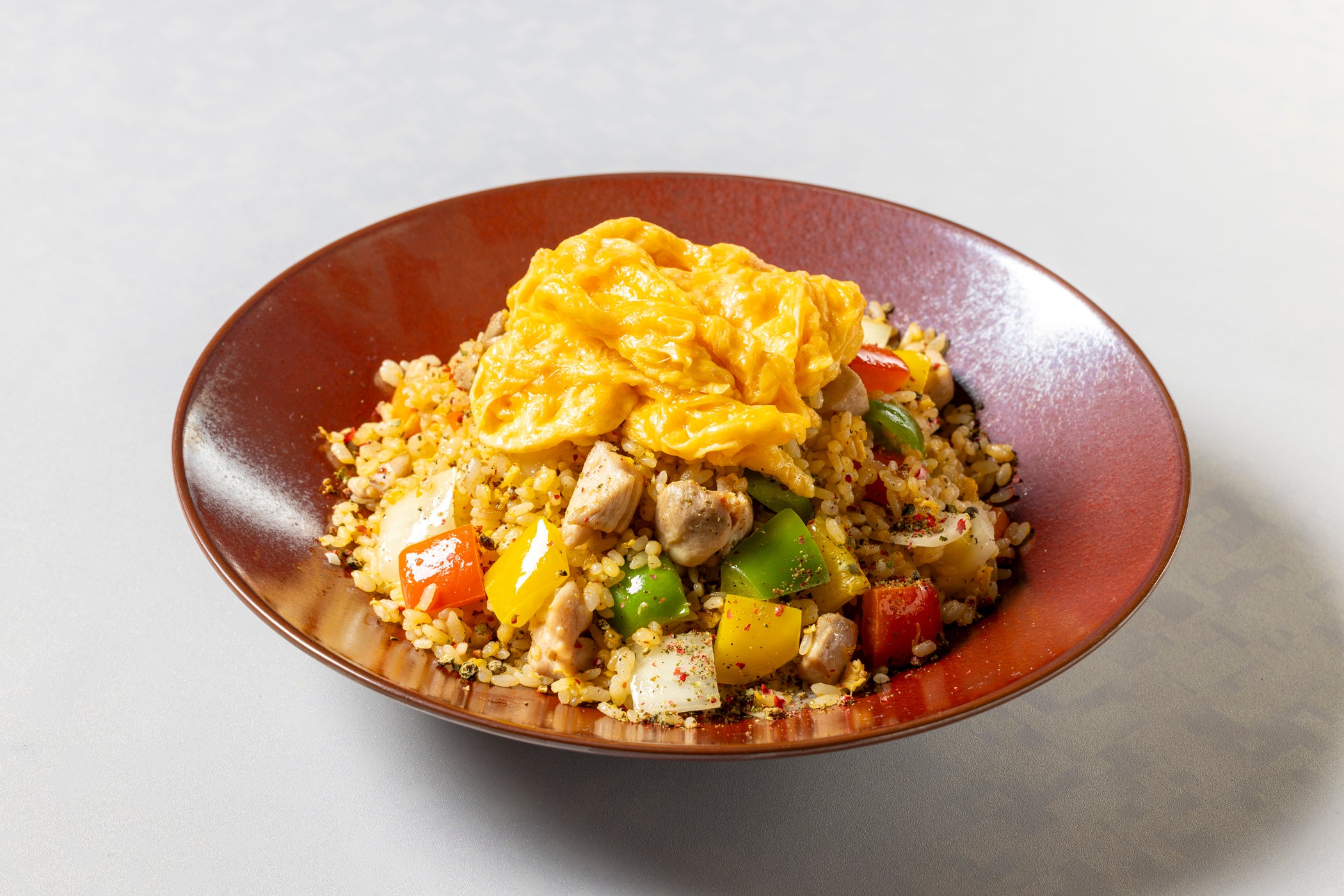 富士の名水で育った質の高い信玄どりと彩り豊かなパプリカを自家製豆板醤や辣油のほか、ピンクペッパー、ブラックペッパーやグリーンペッパーの3種のスパイスで炒め、パラパラに仕上げた炒飯です。炒飯の上にはふわっと焼いた卵をトッピングして仕上げます。