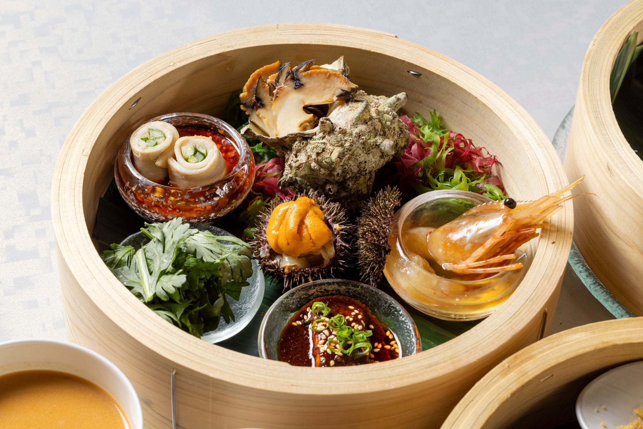 ウニや鮑など豪華食材を詰め合わせた3段セイロ冷麺や桃の冷製カッペリーニもご用意
