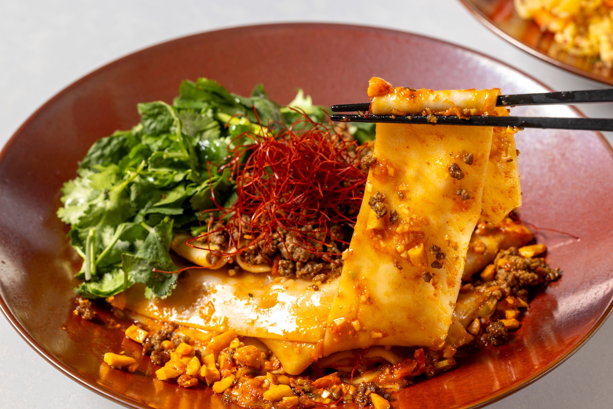 中国中央部に位置する陝西省(せんせいしょう)の郷土料理である幅の広い形状が特徴のビャンビャン麺をつかった逸品です。唐辛子の塩漬けや一味とともに炒めた香り豊かな国産の牛ミンチが幅広い麺によく絡みます。たっぷりとトッピングしているパクチーがさらに辛みを引き立たせ、最後まで飽きずにお召し上がりいただける新作メニューです。