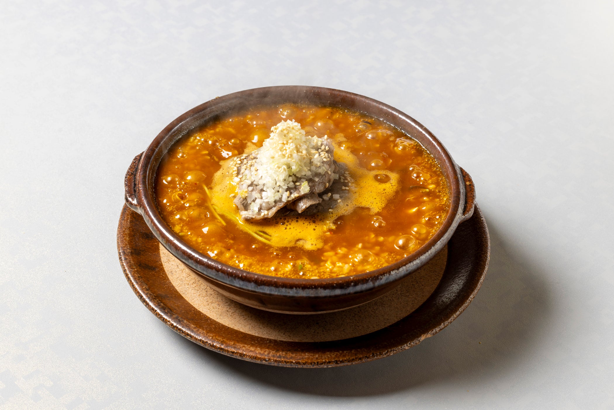 国産牛サーロインのしゃぶしゃぶを贅沢にのせた炒飯に、麻辣スープをかけました。痺れる辛さの山椒や豆板醬の香りが食欲を誘う、韓国料理のクッパから着想を得た一品です。土鍋でご用意いたしますので、熱々のスープを最後の一滴までお楽しみください。