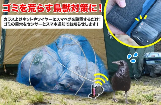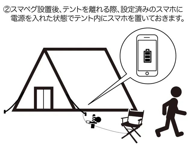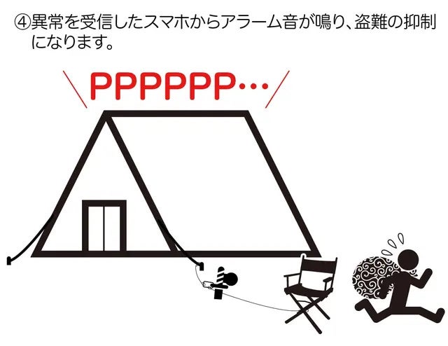 また、日常使いをしないスマートフォンなどをテント内へ配置しておけば、スマートフォンからの警告音(ビープ音)で、ユーザー自身が遠距離にいる状況でも、音で驚かせる・周り方に気づいてもらうことが可能です。