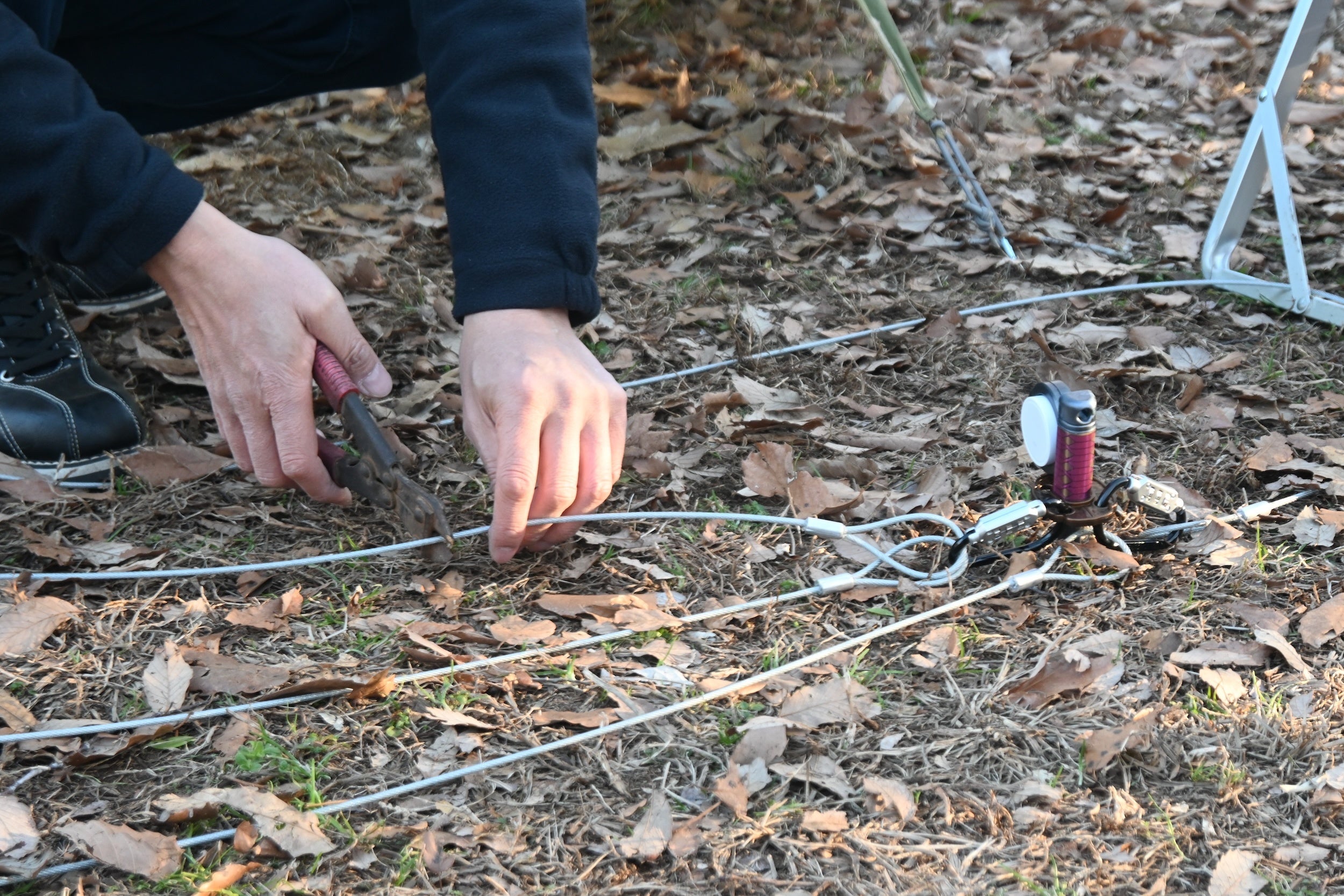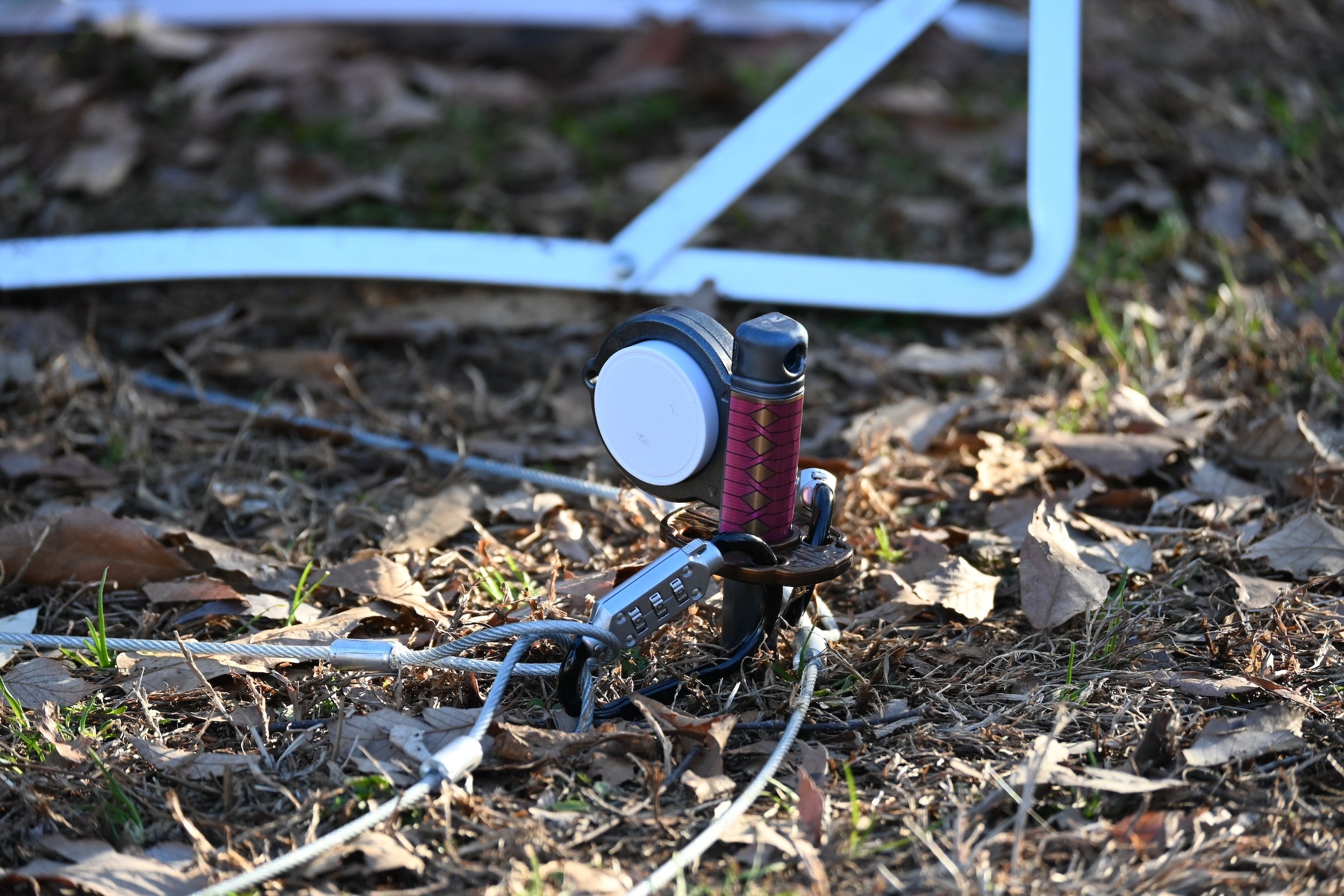 ワイヤーを切断しようとしたり、カラビナを取ろうとしたり、ペグ自体を抜こうとすると振動センサーが反応します。