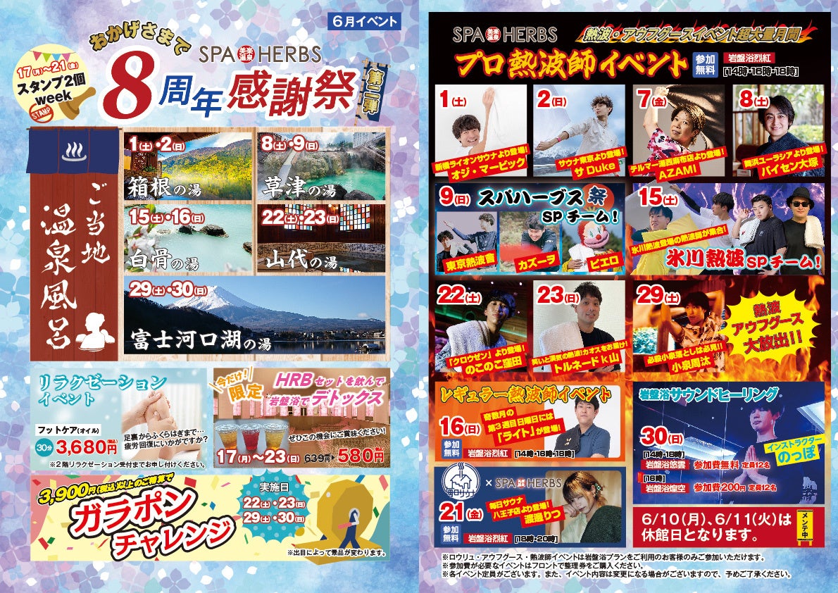 6月は大人気ご当地温泉入浴イベントを開催!週末は日本各地の人気温泉地の入浴剤を投入します!