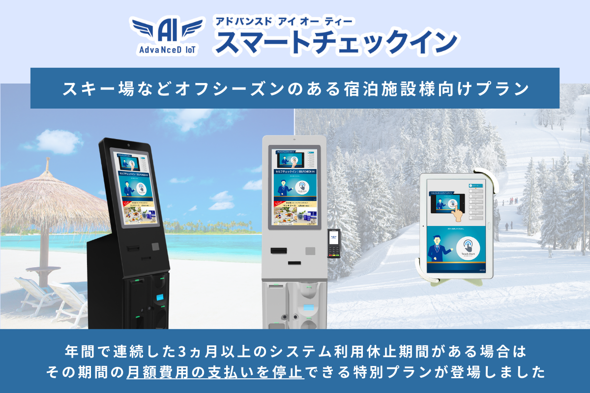 株式会社デバイスエージェンシー(大阪市西区)は5月28日、無人チェックインシステム「AdvaNceD IoTスマートチェックイン」シリーズに、オフシーズンのある宿泊施設様向けのプランを追加しました。このプランを利用すると年間で3ヵ月以上、スマートチェックインの利用休止期間がある場合に限り、その間の月額費用を停止できます。