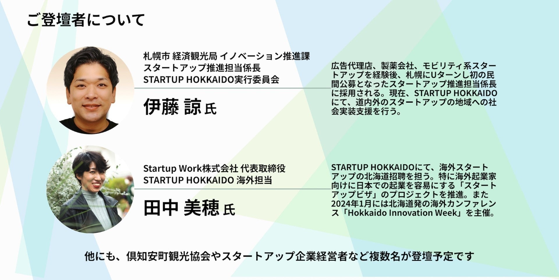本イベントでは、地域事業者や自治体職員、観光協会職員に登壇いただき、現状の問題点を深堀し、今後の展望を語るトークセッションやパネルディスカッション、また地域課題の解決に向けた提案として、道内外のスタートアップ各社による事業発表を行います。さらにイベント終了後には、参加者同士の新たな交流や相互に興味・関心の企業同士のマッチングなど、イベント登壇者以外の方も参加できるネットワーキング(交流会)を設ける予定です。倶知安町をはじめとした道内自治体の住民の皆さま、事業者の皆さま、また北海道にてスタートアップ支援やスタートアップ企業を経営する皆さま、さらには地域課題の解決にご関心のある方、ぜひご参加ください。