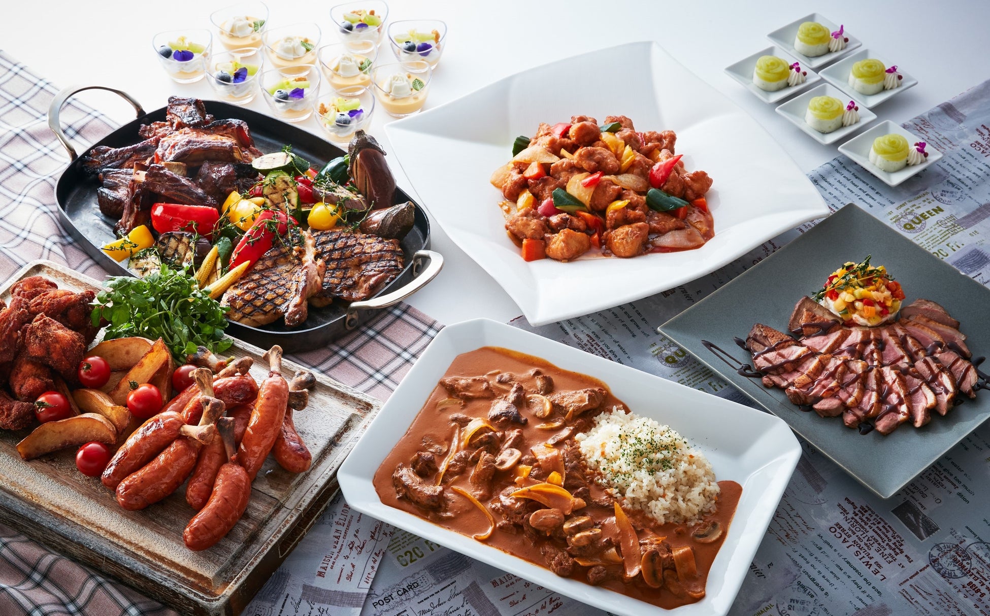 7月はビーフストロガノフ、鴨のローストなど世界の肉料理、8月はスペアリブ、チキングリル、スパイシーフライドチキン、骨付きグリルソーセージをはじめとしたファミリーでお楽しみいただけるバーベキューをイメージした料理を提供いたします。