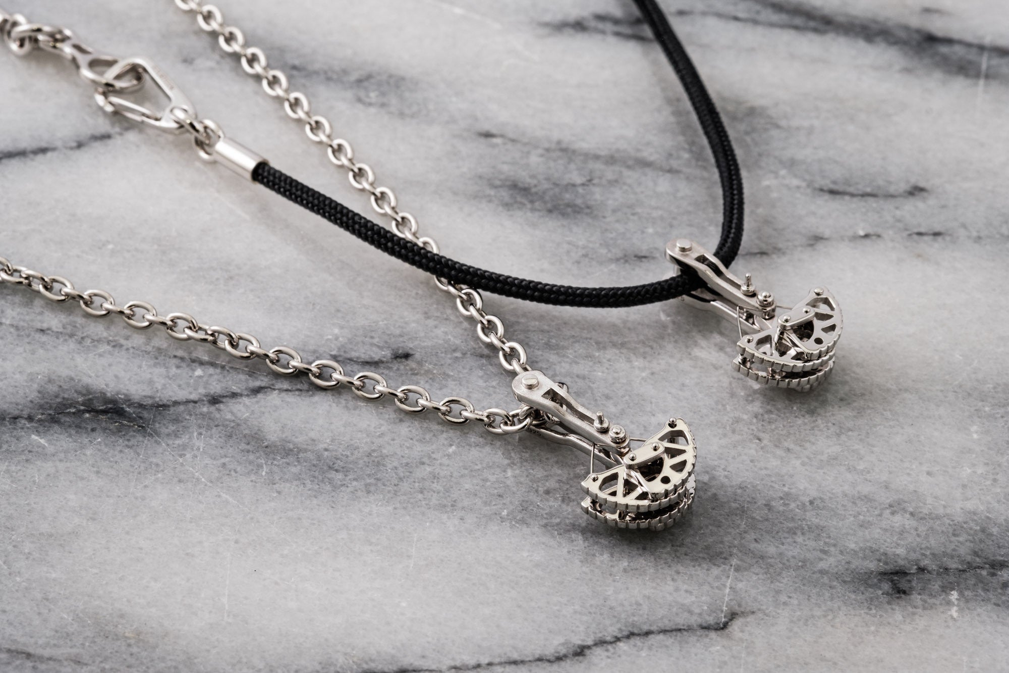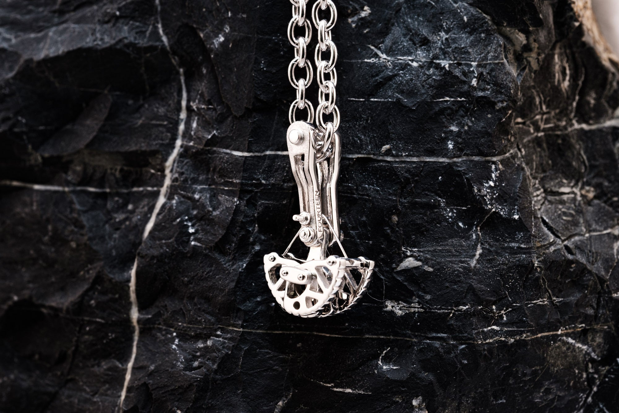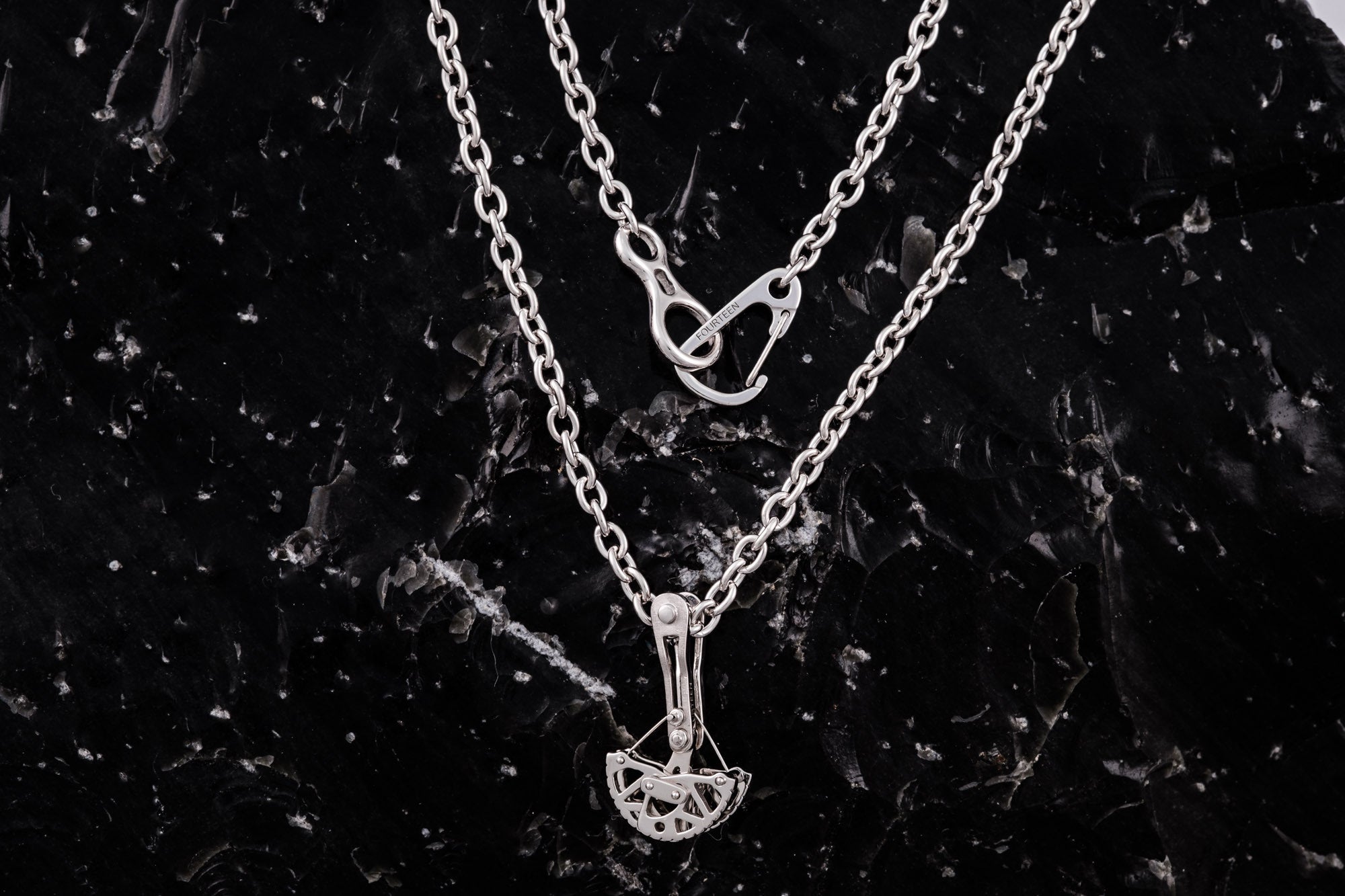ユニセックス ペンダント 『MATE』は、クライミングギアとして使われるフレンズやキャメロットに代表されるカミングデバイスをモチーフしたネックレスで、実物と同様のアクションが可能な可動式ジュエリーです。バチカン部分は、エイトリングとカラビナをモチーフにし、クライミングギアとのセットがクライマーズアイデンティティを表現。パラコードとチェーンタイプの2点をご用意。