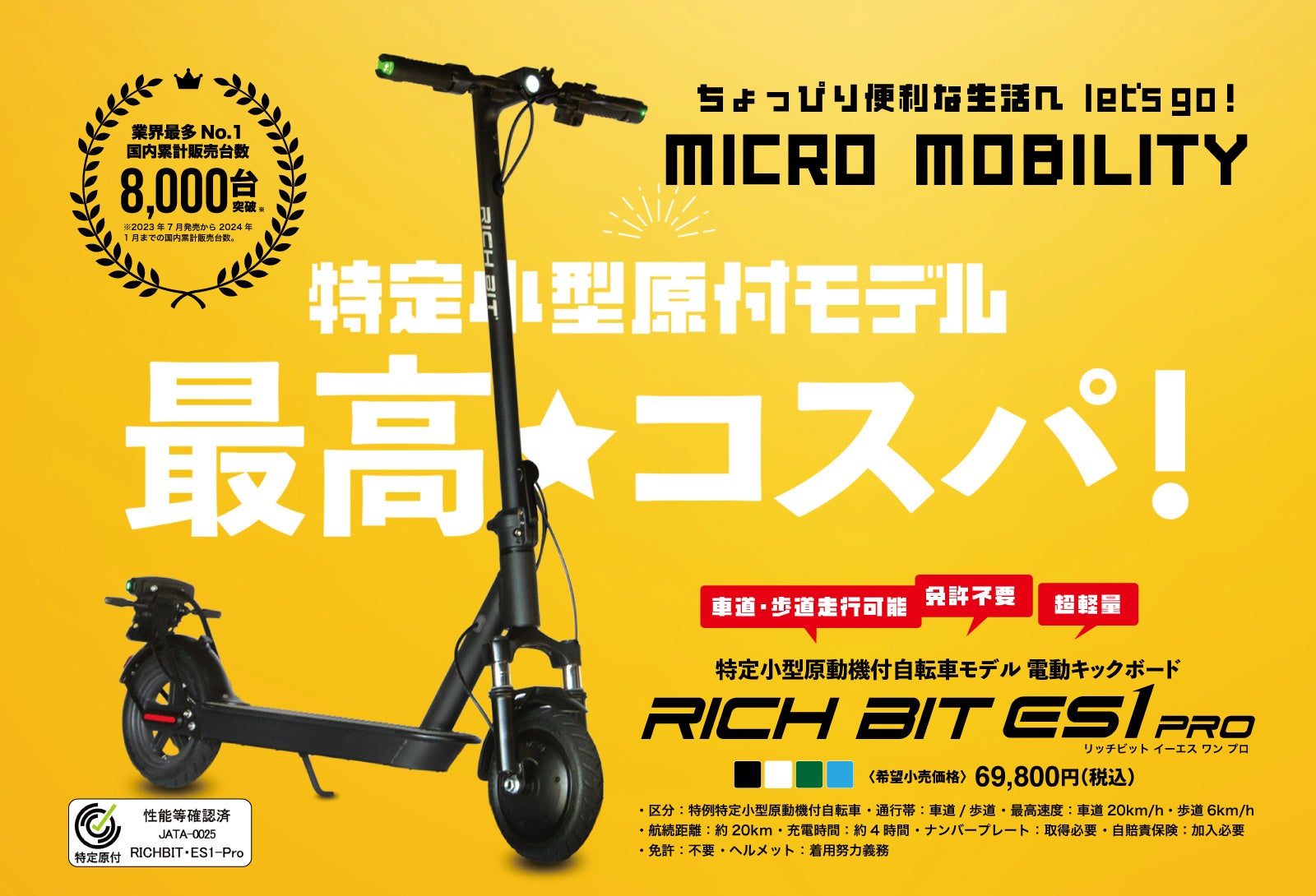その1,2024年5月15日から先行予約販売中の新型電動モビリティの特定小型原動機付自転車(特定小型原付)「RICHBIT CITY(リッチビット シティ)」と同機種の電動アシスト自転車「RICHBIT CITYASSIST(リッチビット シティアシスト)」限定1,000台で、現在Max25%割引で先行予約発売中です。納品予定は7月下旬からを予定しています。