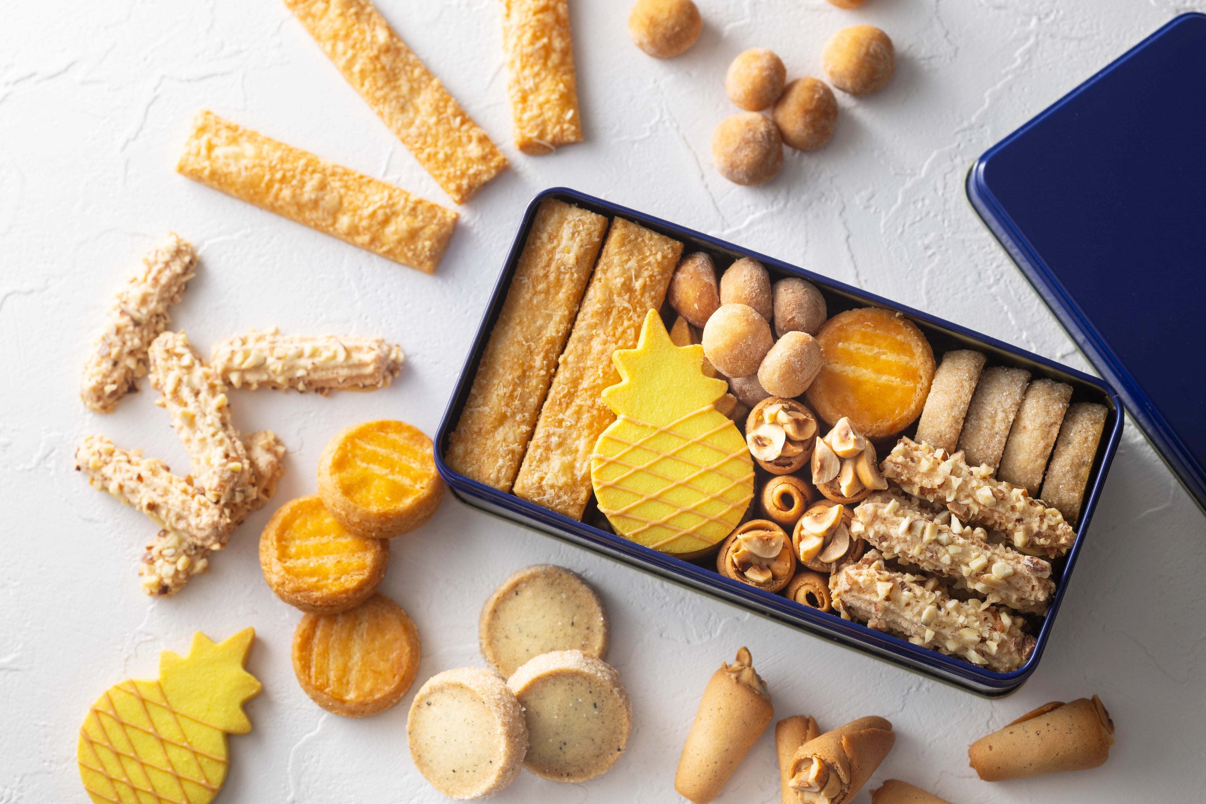 四季折々、時節の風情を表現する玉手箱のようなクッキーアソート。夏らしくチーズの塩味やスパイスを効かせたクッキーをはじめ、楽しい驚きを込めた7種を詰め合わせました。愛らしいパイナップル型のクッキーには、ターメリックとマンゴーの風味をつけブロンドチョコレートで格子柄をデコレーションするなど、シェフの遊び心が光ります。