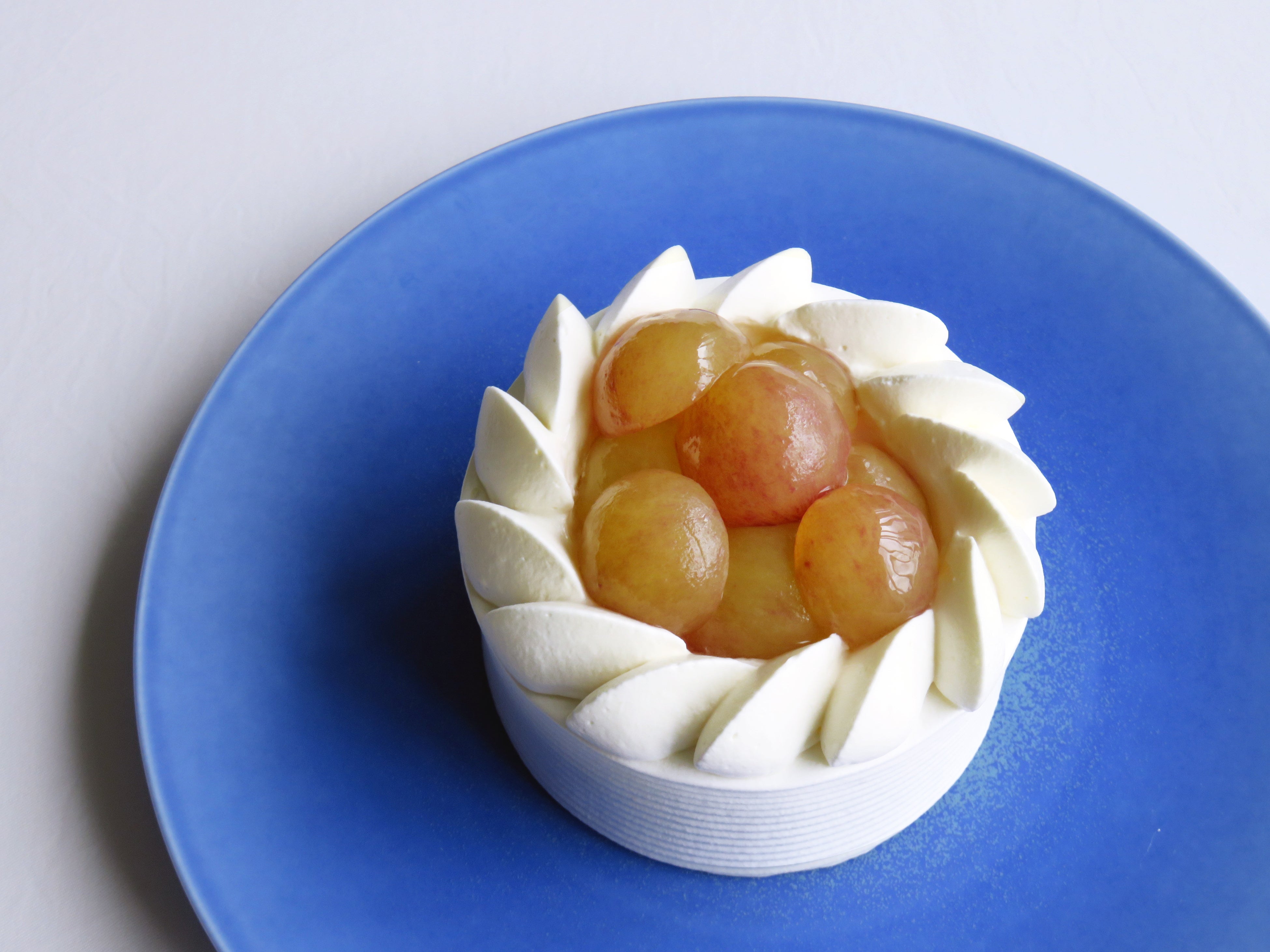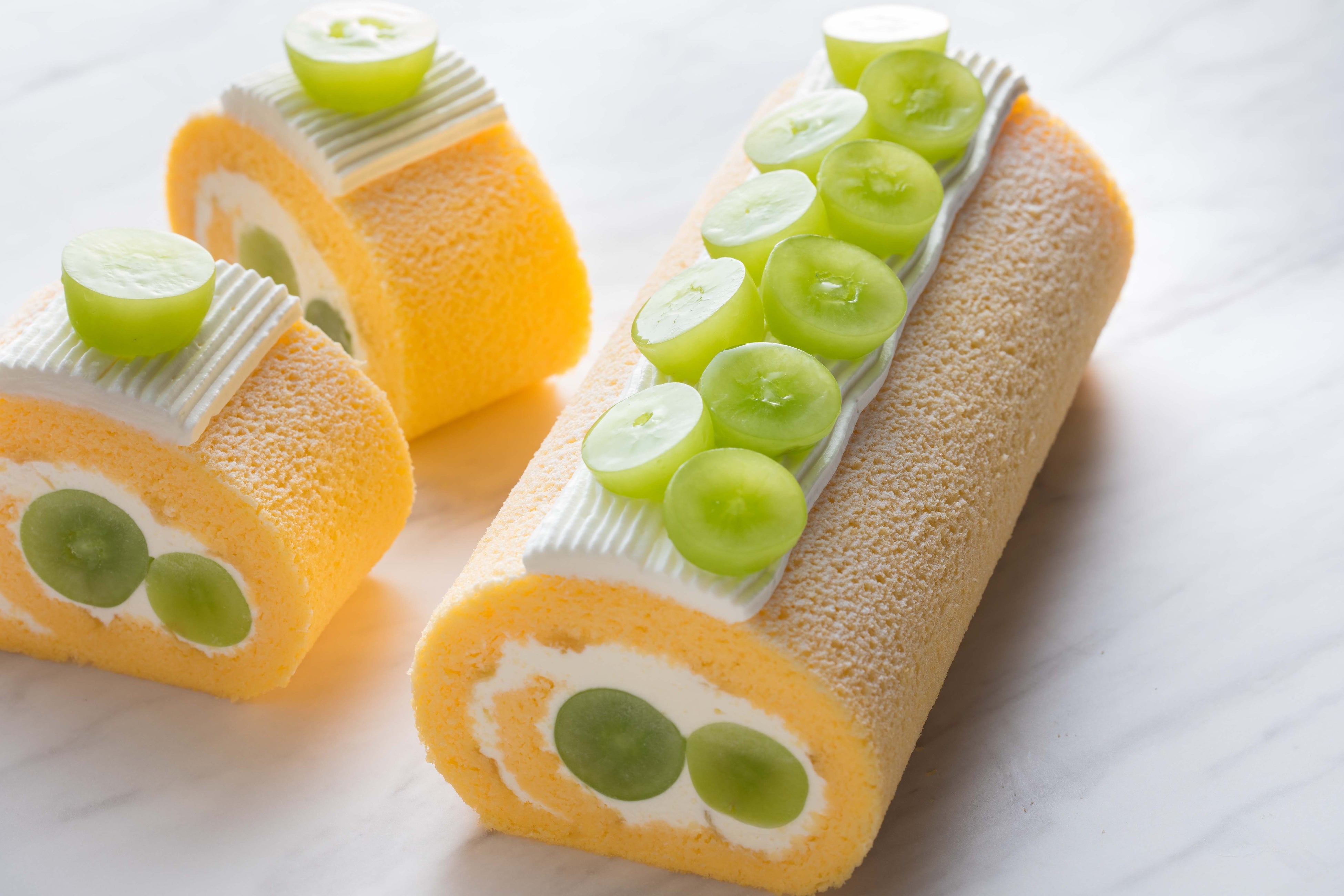 みずみずしいシャインマスカットを粒ごと惜しげもなく使った華やかなロールケーキ。マスカットリキュールをあわせた香り高い生クリームやコンフィチュール、ジューシーな果肉が贅沢な味わいを演出します。