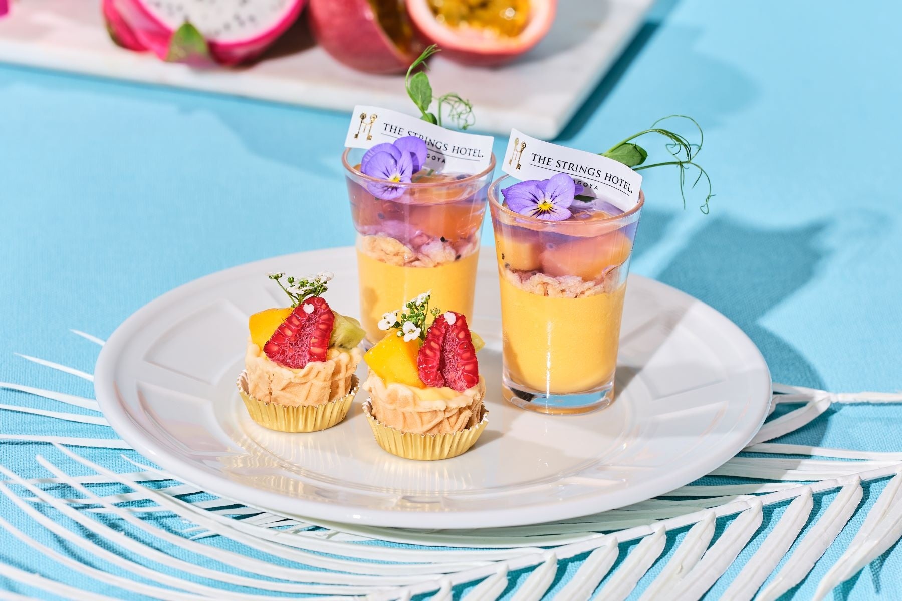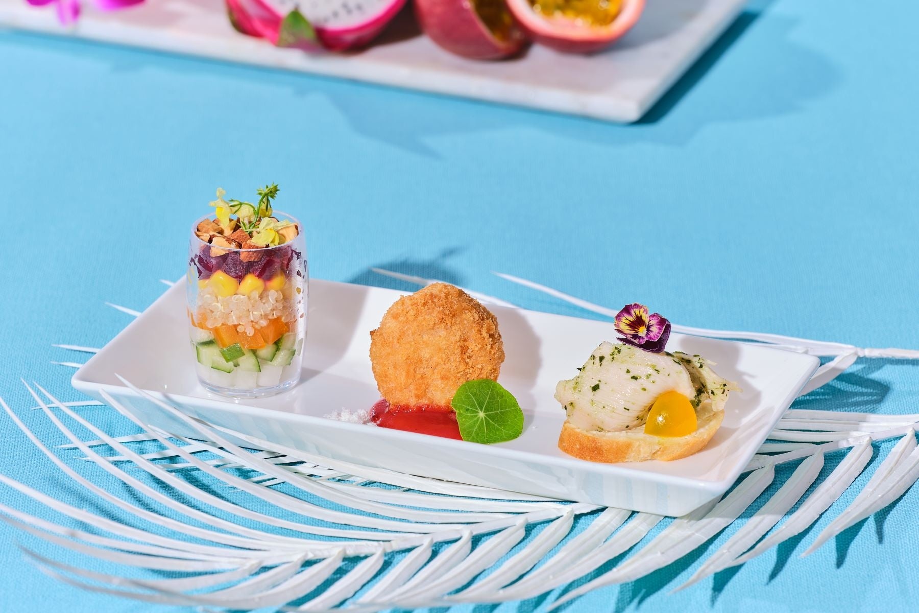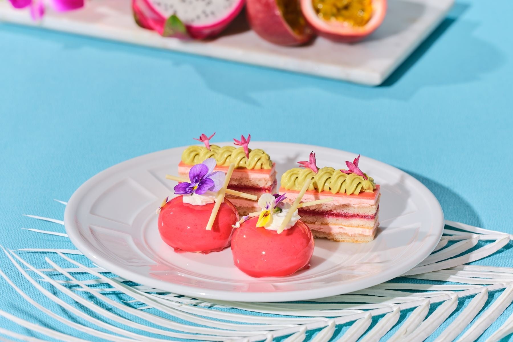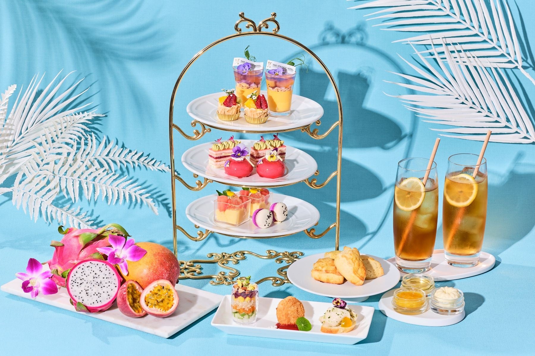 スイーツスタンドには、グラデーションが美しいバタフライピーを使用したパンナコッタ、マンゴーやキウイを使用したタルト、南国感じるグアバのオペラ、艶感のある丸いフォルムがかわいらしいココナッツのムース、スイカのトライフル(層状に重ねたイギリスの伝統スイーツ)、ドラゴンフルーツのマカロン の6種が並びます。ヴィヴィットなカラーが美しく、見ても食べても”心躍るような”特製スイーツは、甘みと酸味のバランスが絶妙で、軽やかで爽やかな風味をお楽しみいただけます。また、塩味のあるシェフ特製のセイボリーは、パエリアリゾットコロッケ、バケットにジェノヴェーゼで和えた鶏胸肉を乗せたブルスケッタ、キヌア・ビーツ・アーモンドなど8種を使用したヴェリーヌ仕立てのサラダ の3種類をご用意。