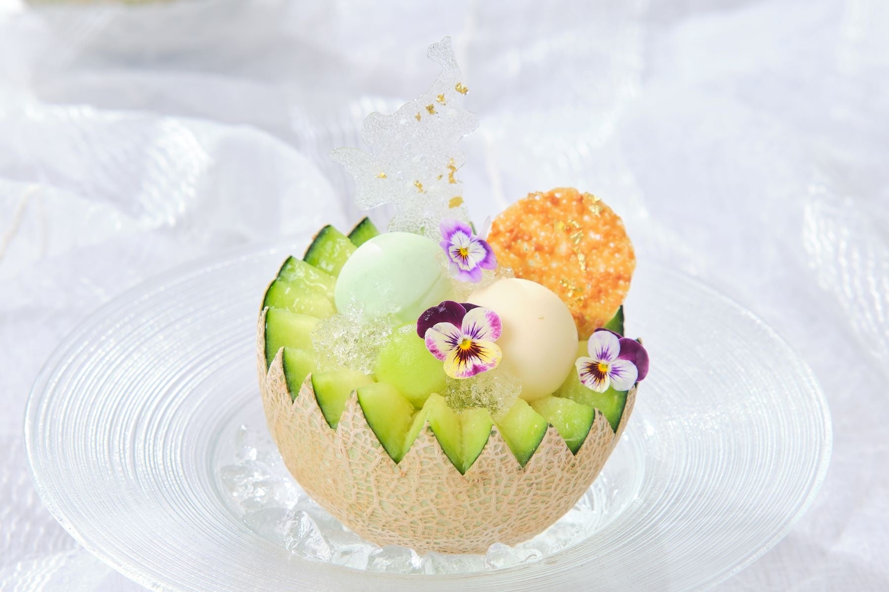 フレッシュメロンを半分に割り、くり抜いた中にメロンの果肉、メロンとヨーグルトのアイス、カスタードクリームを重ね、その上からスタッフが目の前でスパークリングワインを注ぎ完成する贅沢なメロンソーダをオプションでご用意(スパークリングワインボトル1本付き)。メッセージプレートもつけられるので、誕生日などお祝いのサプライズとしてもおすすめです。