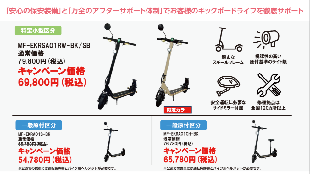 同社のモビリティを中心としたブランド「MEISTER.F(マイスターエフ)」の電動キックボードで走行中に「もしも」や「万が一」の怪我をしても、安心な傷害保険を1年間無償で受けられるサービスで、「保安部品の充実」「アフターサポート拠点の充実」「安心の1年保証」と併せて「買って安心」・「乗って安心」を強化したサービスとなります。