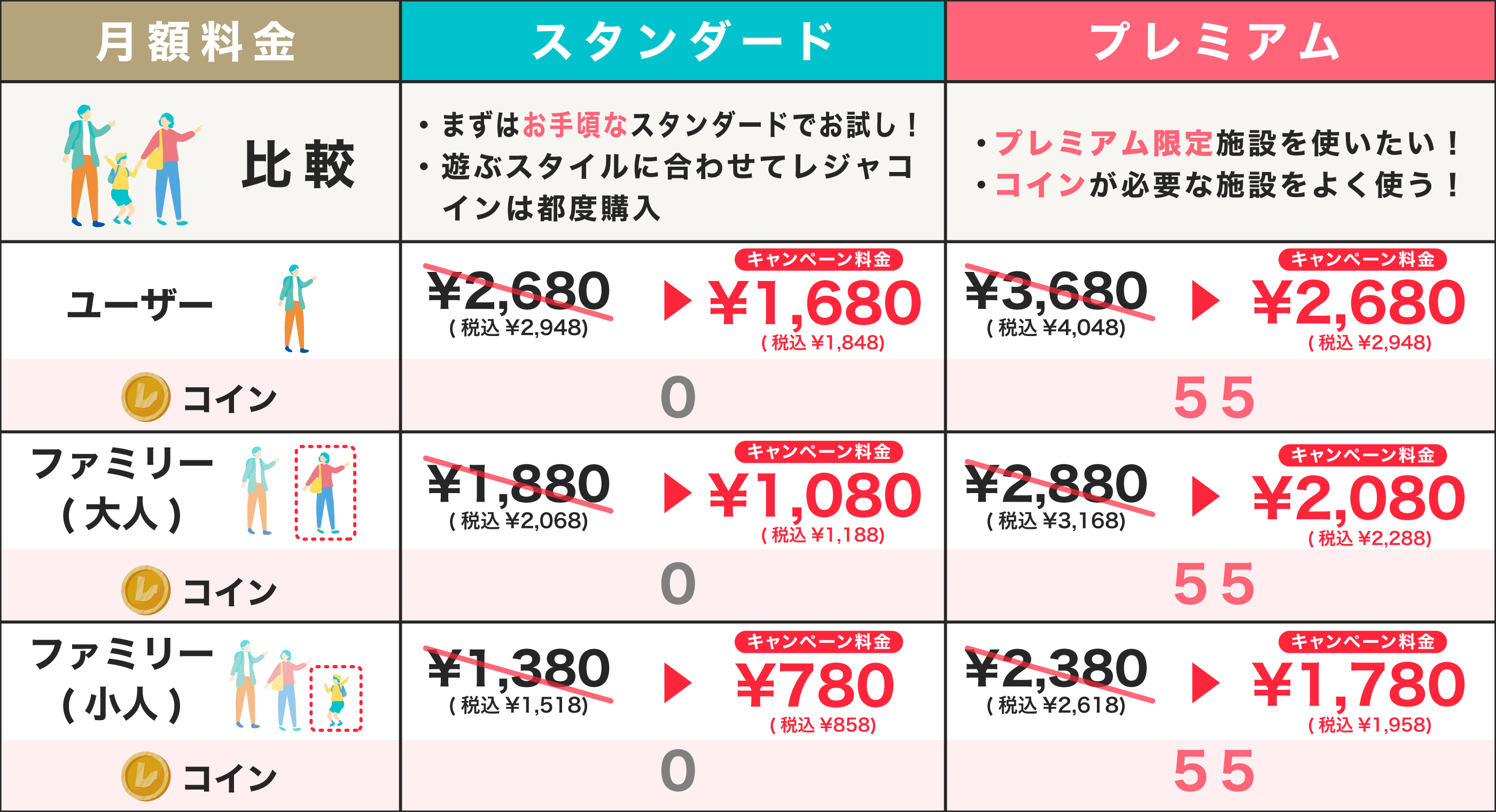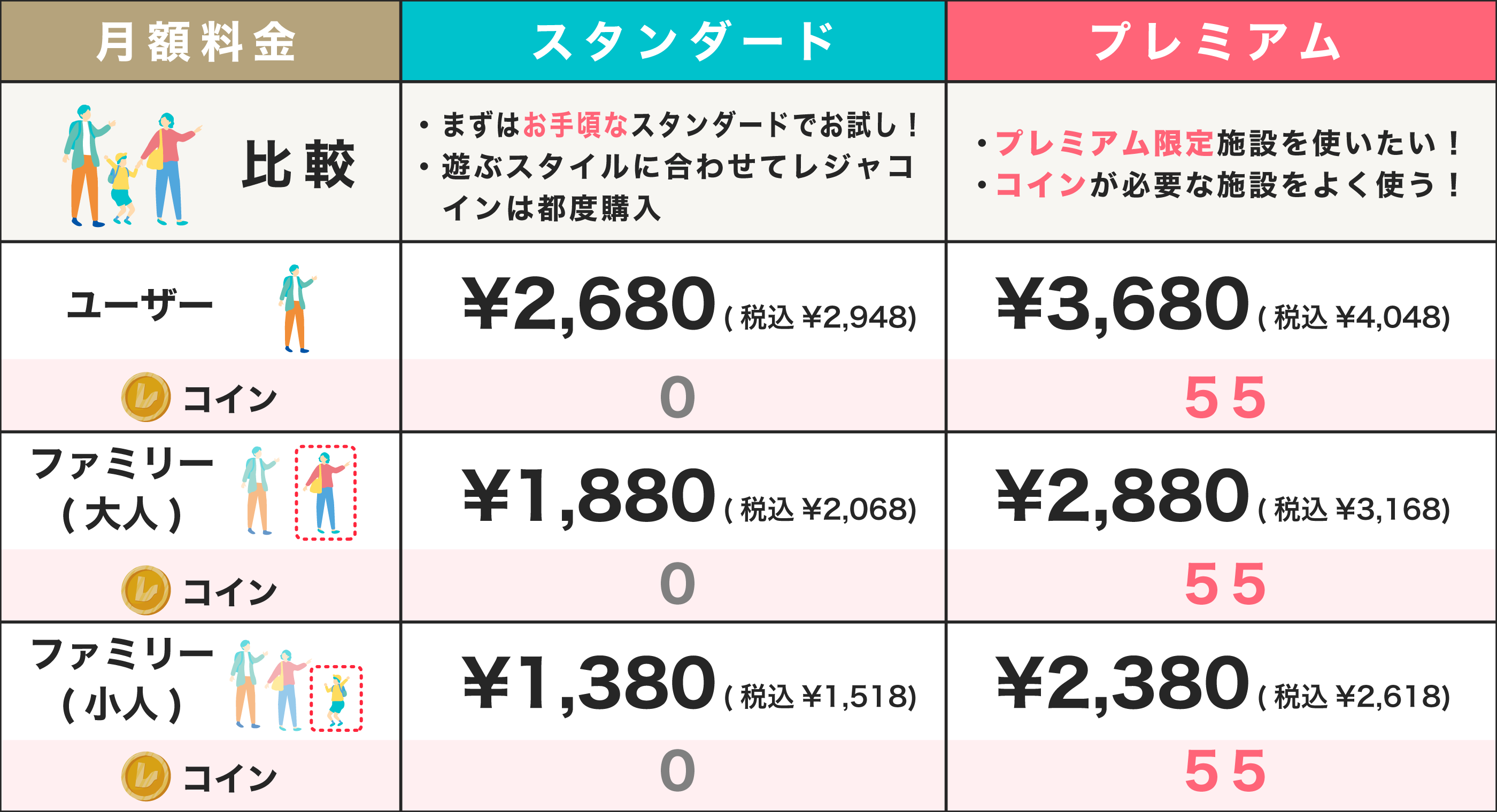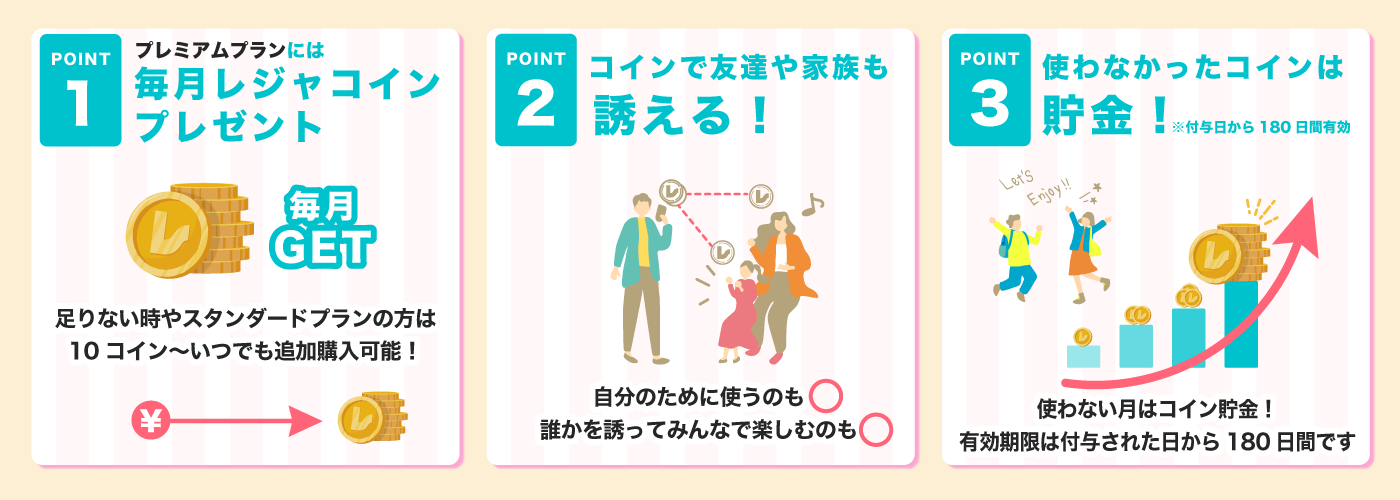 プレミアム会員様に毎月付与される、レジャパスサービス内通貨「レジャコイン」は全会員様が購入することもでき、高単価な施設を利用したり、非会員の方をゲスト招待したりすることができます。