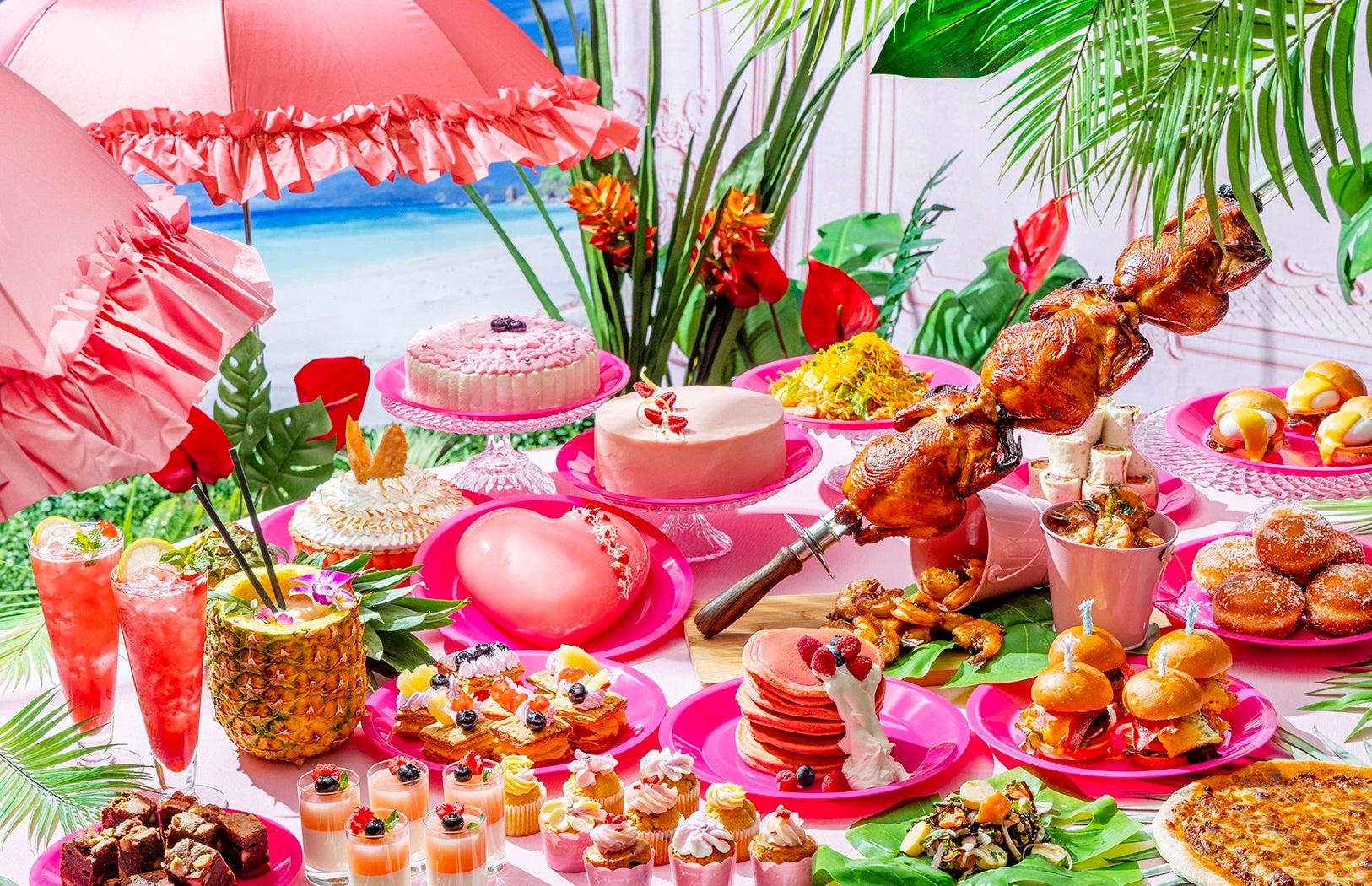 デザートには、苺フレーバーのピンク色のパンケーキ、ピンクのハート型の「ミラーケーキ」などハワイの陽の下でリゾート気分を味わいながら食べたい多数のピンクスイーツがビュッフェ台を華やかに彩ります。