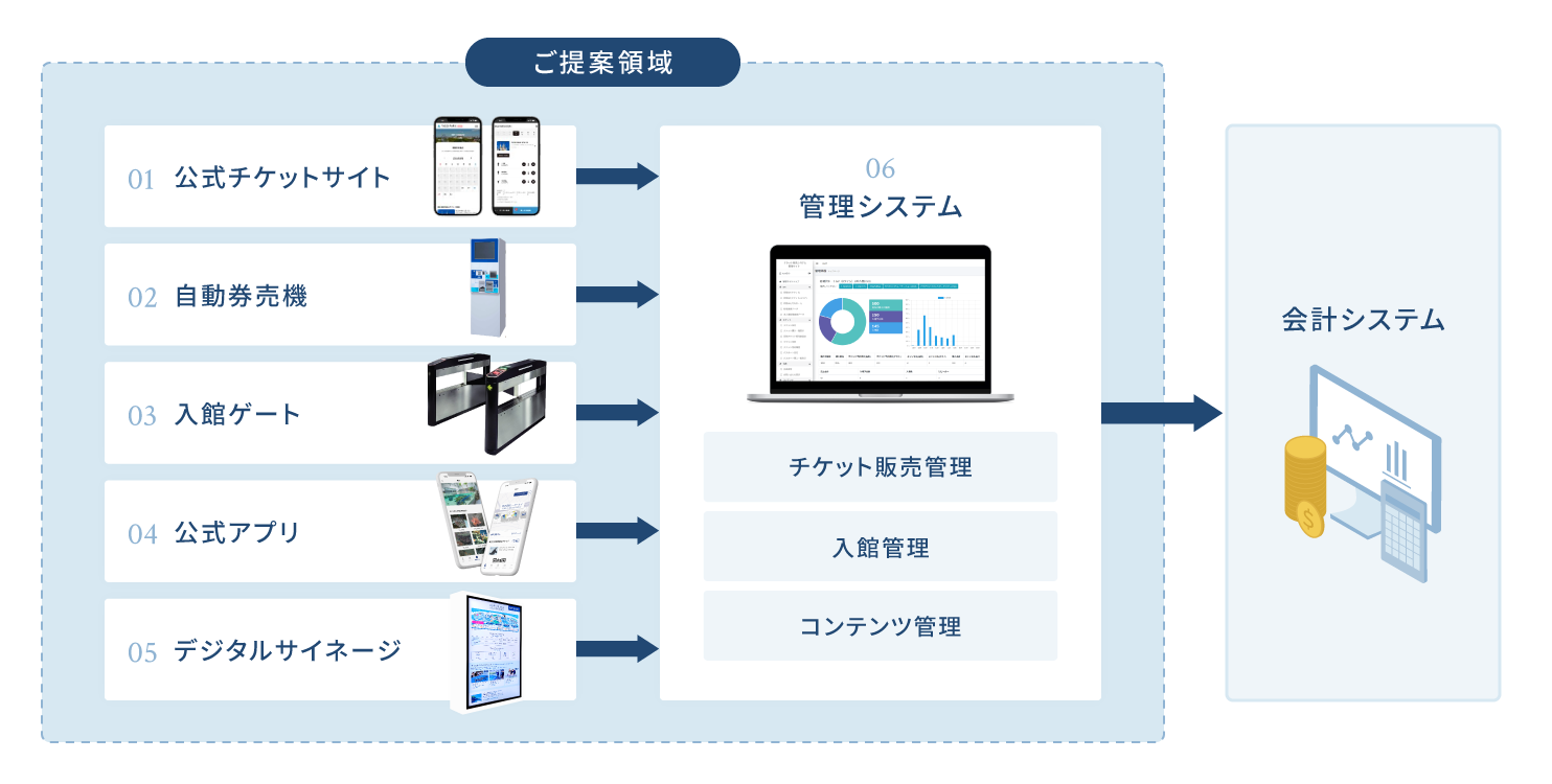 入館ゲートにおけるQRチケットの読み込み、複数ゲートにおける入館/再入館対応、入退館のカウントなど入館ゲートとのシステム連携を行いました。これにより館内すべてのゲートにおける入館、売上一括管理を実現し、オペレーションコストを最適化し、スムーズな施設運営が可能となります。