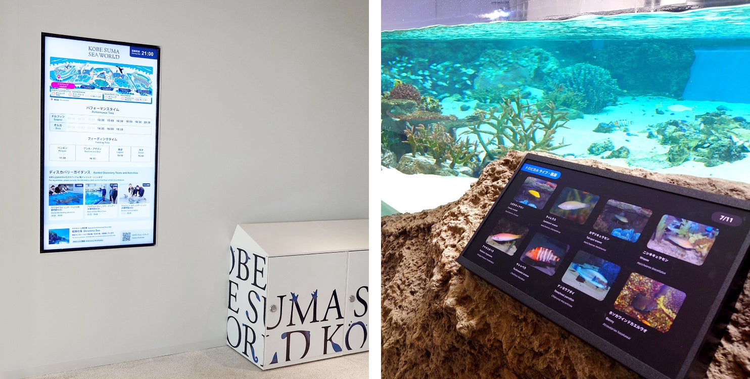 パフォーマンスのスケジュールや水槽情報、生きもの情報など、デジタルサイネージや公式ホームページ、公式アプリへ表示させるコンテンツ内容をRAP管理画面上で動的に管理できるように対応することで、効率の良い施設運営を目指し、お客さまへ最新の情報をいち早くお届けできるよう設計しました。デジタルサイネージは、パートナー企業との連携により選定から導入するまでの対応を行いました。