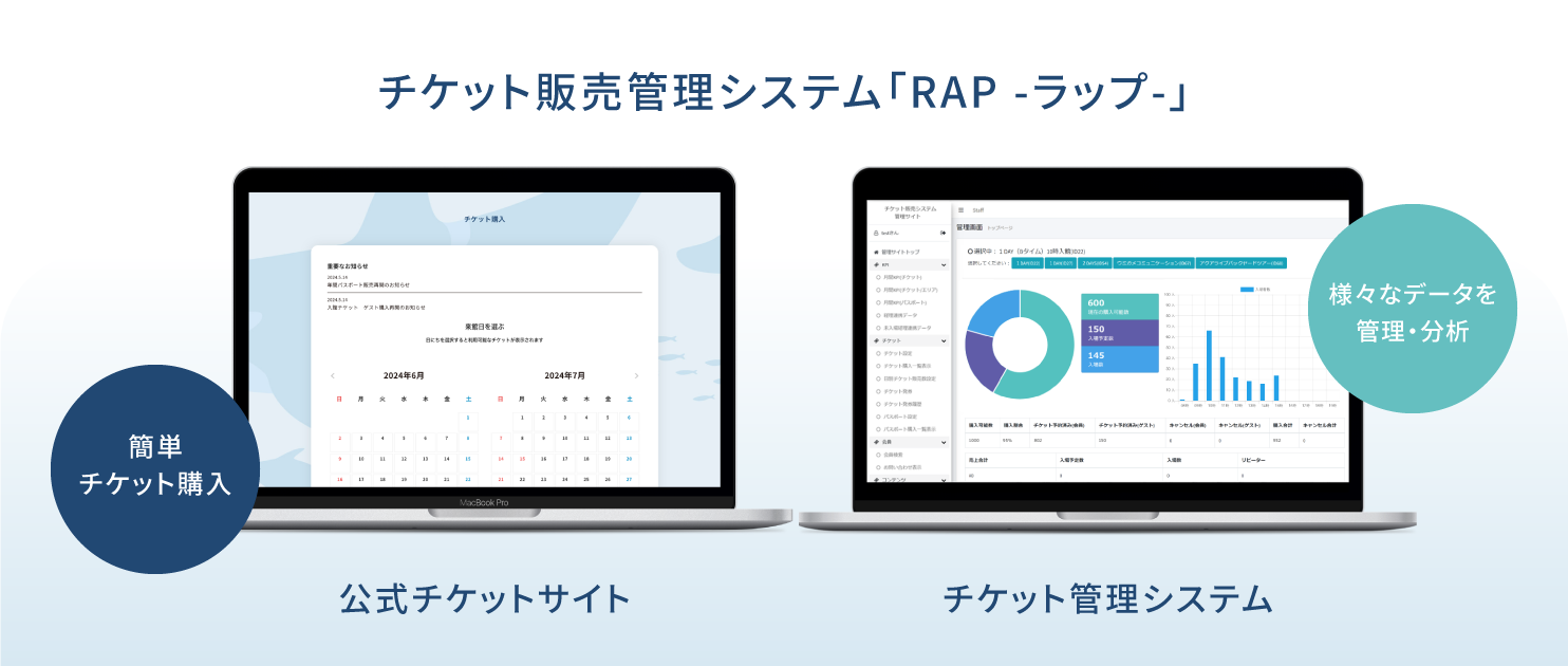 『RAP』は、多くのチケットシステムにおける手数料モデルのコスト管理の難しさや、提供アプリケーションのカスタマイズ制限を解決するために開発されたチケッティングシステムです。チケット販売だけではなく、入館ゲートやサイネージ、パフォーマンスなどのイベントスケジュール管理、年間パスポートの発行など様々な業務を管理できます。