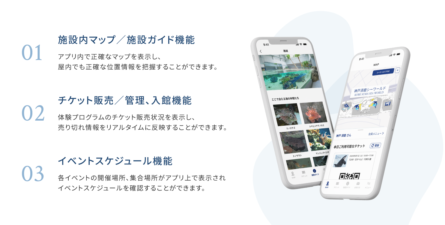 チケットの購入、確認、QRチケットによるスムーズな入館はもちろん、施設内マップや施設ガイド、パフォーマンスや体験プログラムのスケジュールなど、「神戸須磨シーワールド」に関するあらゆる情報の確認ができるアプリです。施設に関わる可能な限りの情報を連携し、アプリを通じて、快適で充実した館内の体験を提供します。