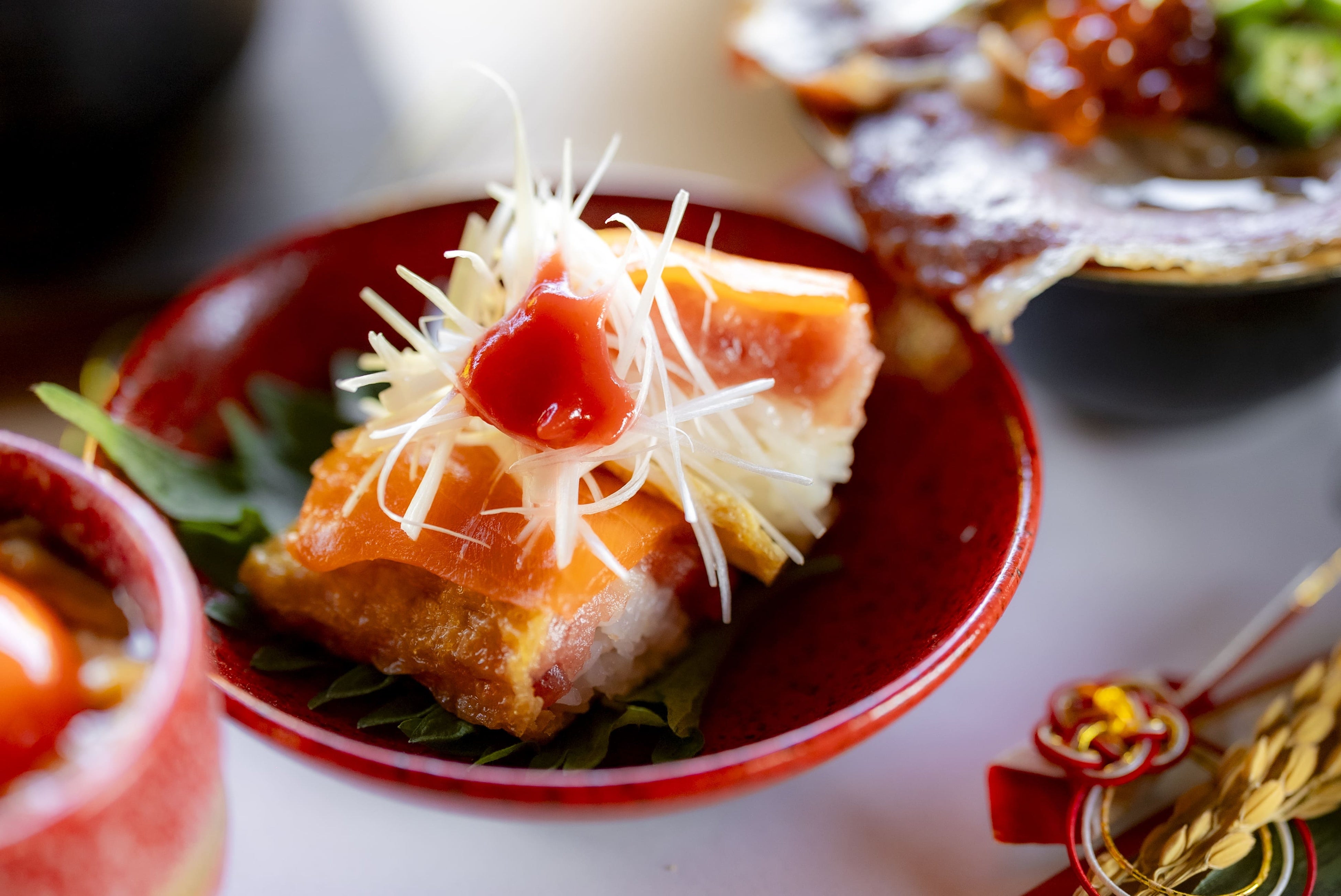 マグロのたたきを巻いたいなり寿司にサーモンといちじくのソースを添えました。