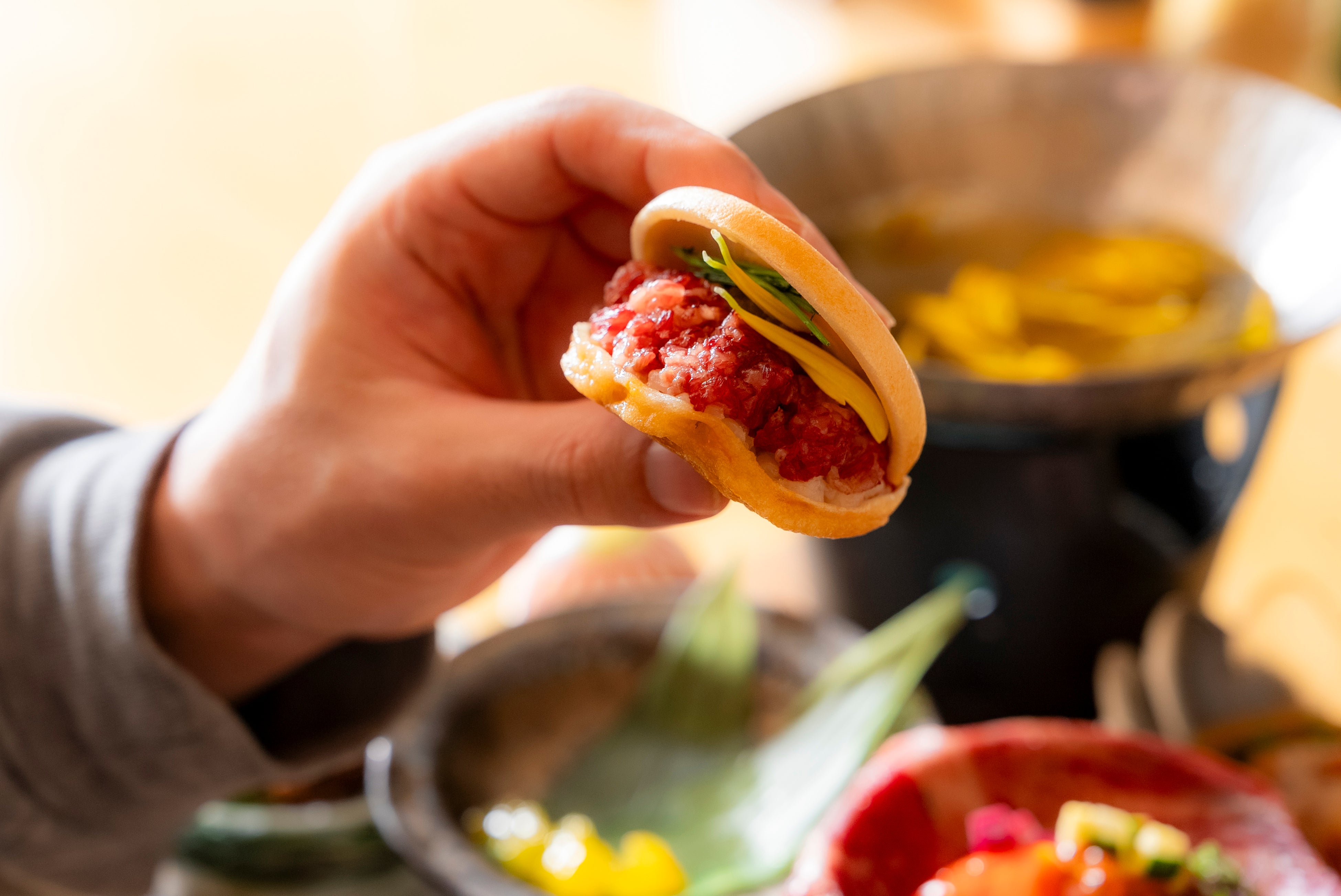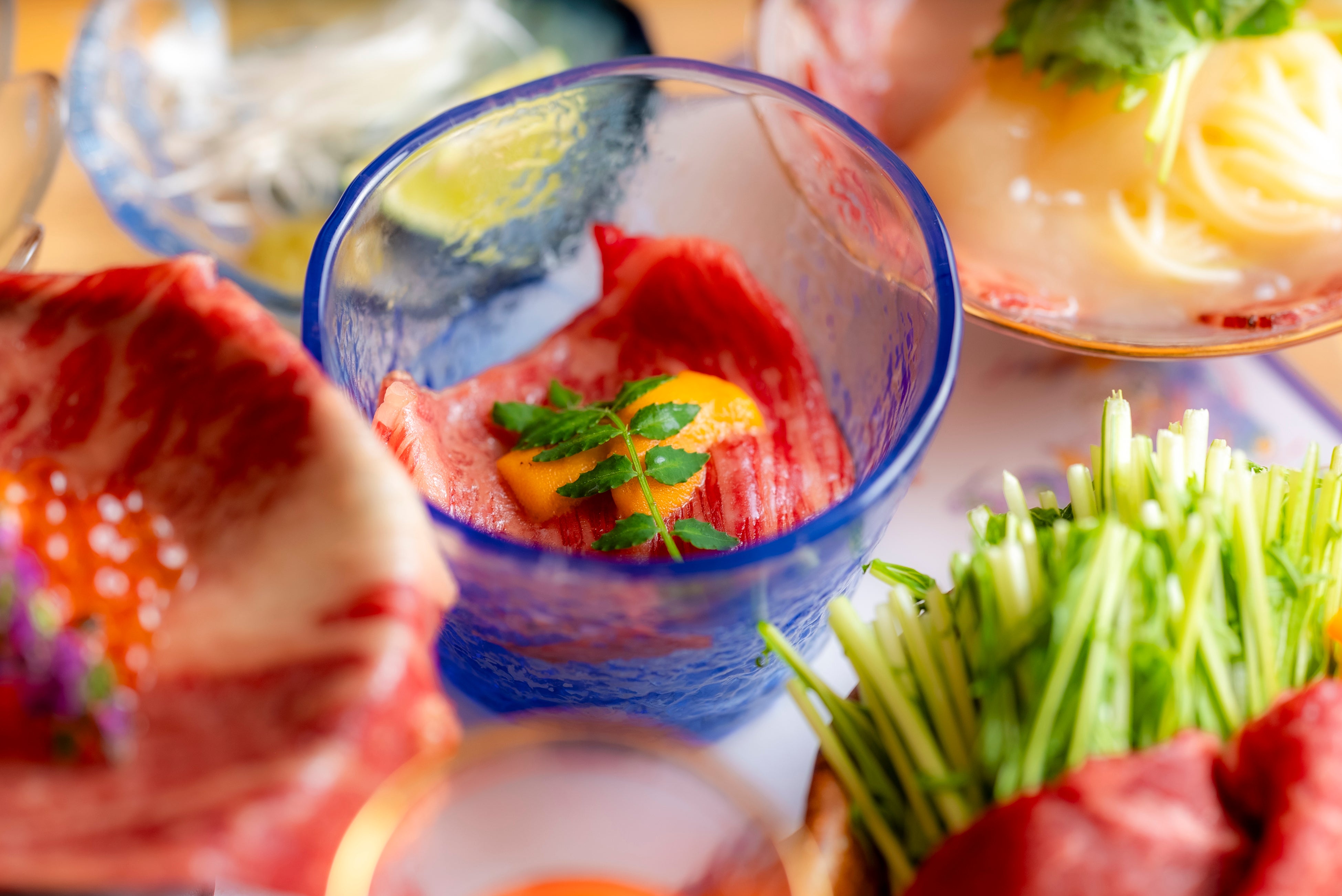 旬の夏の食材と和牛の組み合わせを存分にお楽しみください。厳選された和牛は上質な脂と柔らかい肉質が特徴で、夏の食材と一緒に味わうことで、和牛の旨味がさらに引き立ちます。