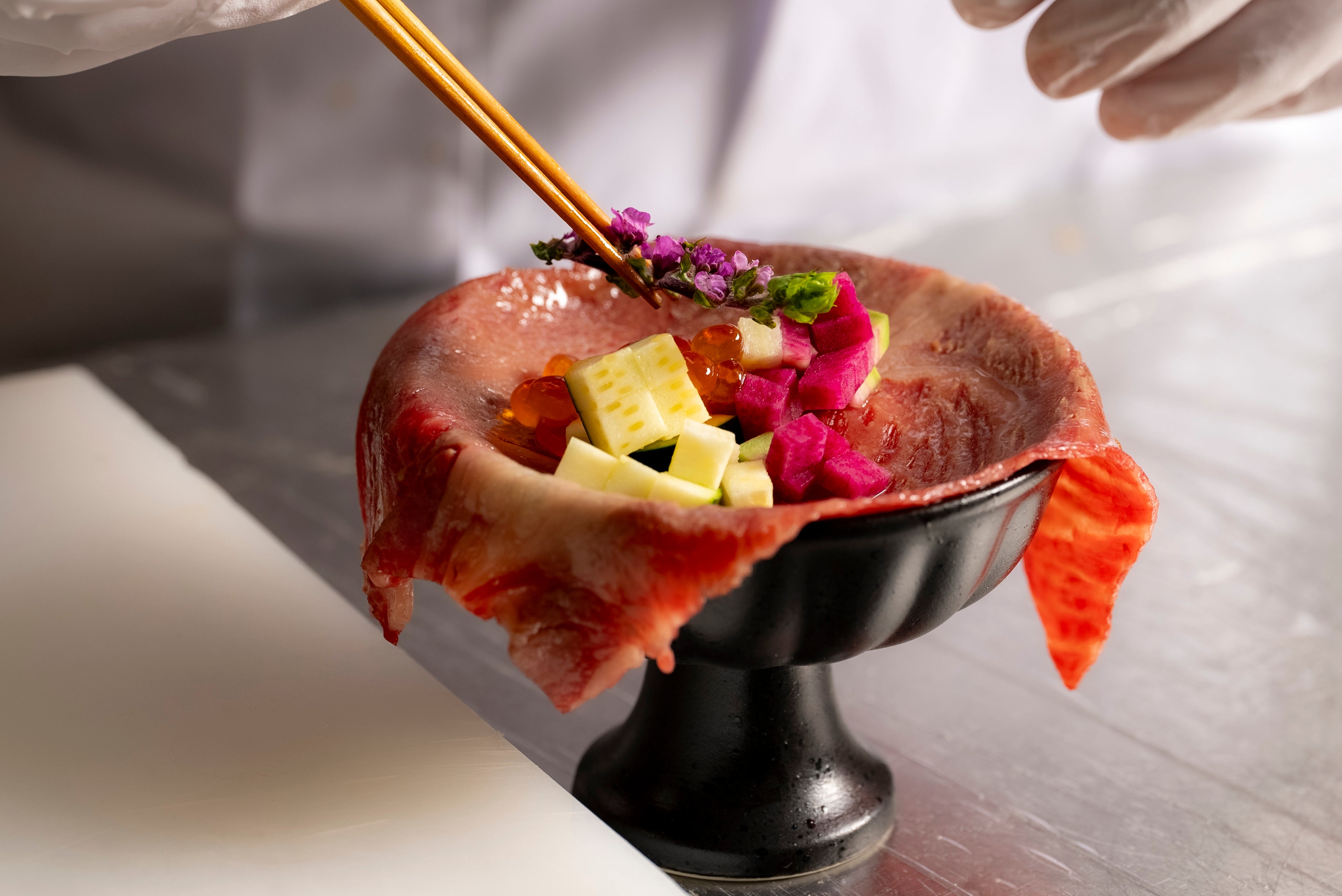 五穀豊穣のお茶屋ごはん®︎ 五木茶屋 先斗町店では、食べ方やこだわりの調理にて新しい京丼を体験いただけます。和牛の内もも肉から取れる希少部位のコモモを使用した丼では、最中と一緒にお召し上がりいただくなど、先斗町店だけでしか体験できない京丼をお楽しみください。