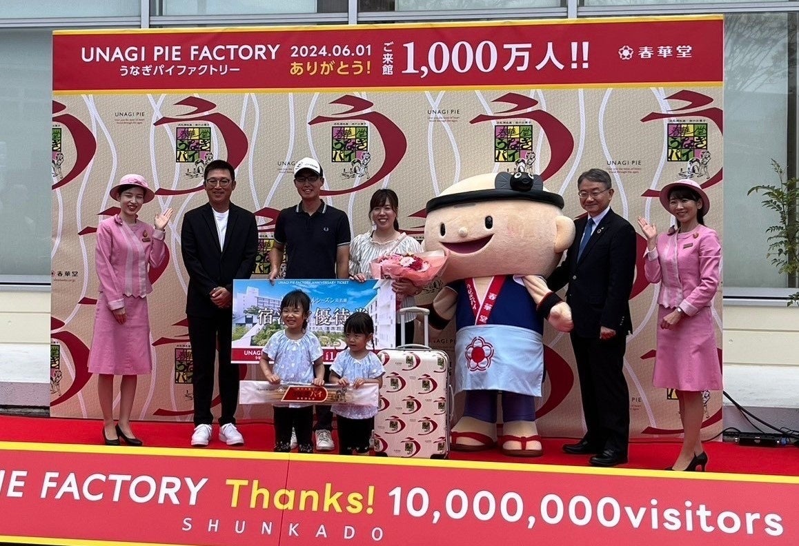 記念すべき1,000万人目となった、茨城県から浜松市に観光で訪れたご家族をお迎えしセレモニーを開催。記念品として、浜松市が出荷額1位となり浜名湖を代表する「ガーベラ」で彩られた花束、1,000万人達成記念で作られた重さがうなぎパイ約30本分の「巨大うなぎパイ」、浜名湖かんざんじ温泉のホテルウェルシーズン浜名湖の宿泊券、そしてうなぎパイキャリーケースをお贈りしました。