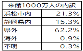 初年度の集客目標は年間10万人であったが、来館者は右肩上がりとなり42万人が来館。2017年度には、大河ドラマ「おんな城主 直虎」の影響もあり、来館者数は過去最高となる70万人を突破し、浜松の産業観光を代表する施設にまで成長しました。