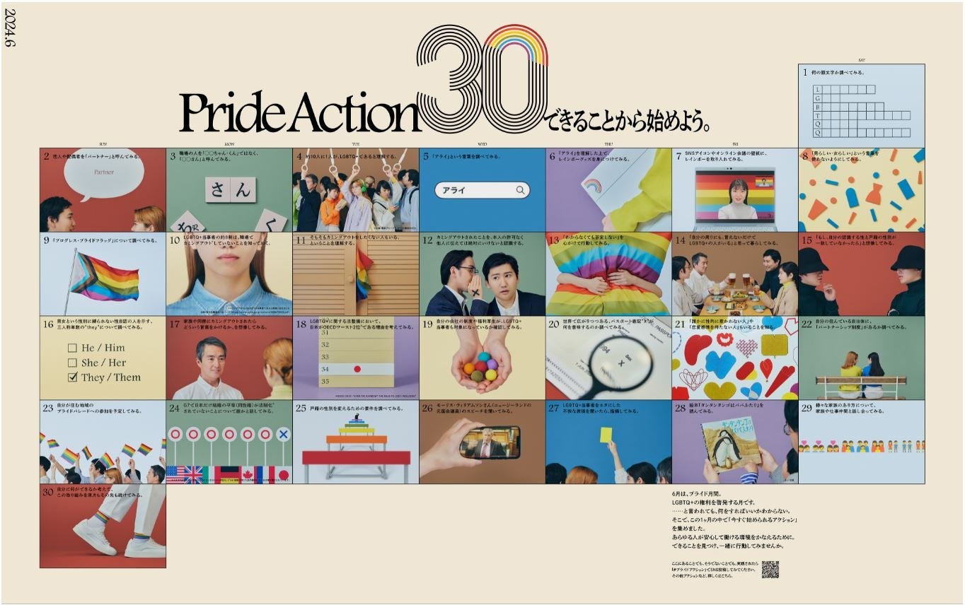 LGBTQ+への理解と支援の声を企業が上げることで、LGBTQ+をはじめとするマイノリティの方々にとって働きやすい環境づくりを前進させ、よりよい社会へとつなげることができるといった考えがこの活動の背景にあります。「Pride Action30」は、LGBTQ+当事者の方々への理解と支援を示す30個のアクションを提示し、実施を促すことで、具体的にどんなことをすればよいか、「皆で共に学んでいくキッカケを提供する」活動です。