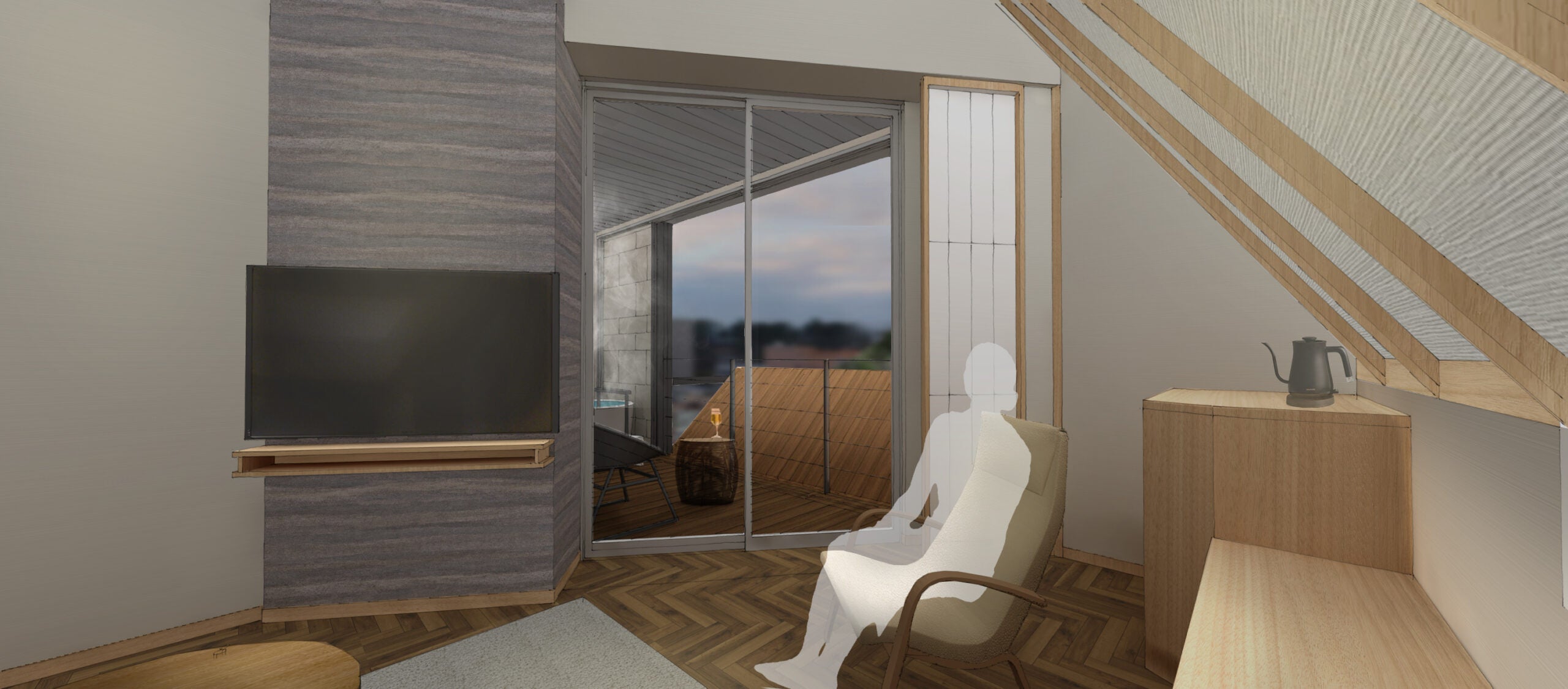 ご家族でもゆったりお過ごしいただける広々としたお部屋です。プライベートサウナで身体を整えながら、贅沢な時間をお過ごしください。