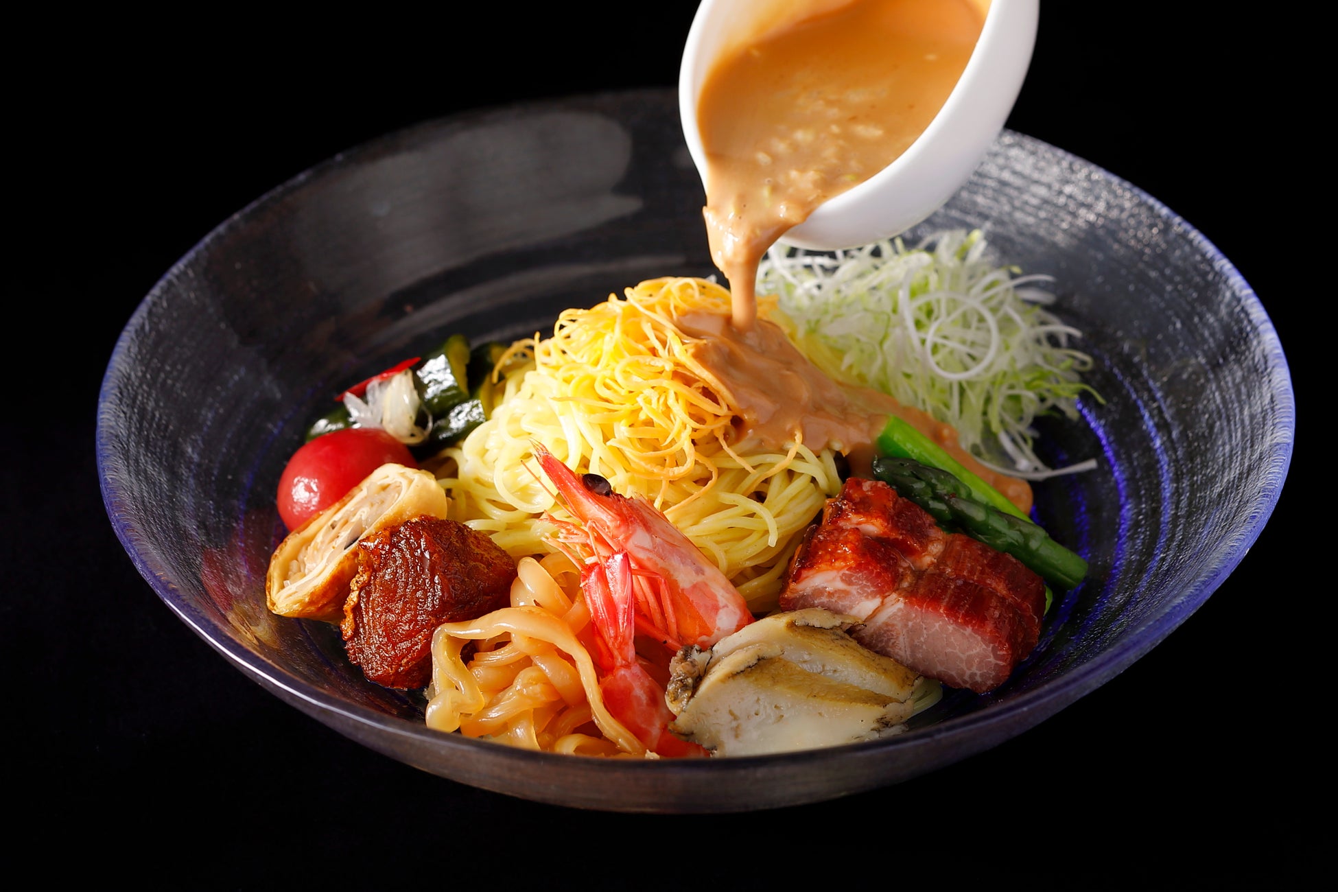 ふかひれを贅沢にトッピングした、ごちそう冷麺がこの夏新作で登場。3種の酢をブレンドした、まろやかな醤油ベースのスープに、ぷるんとしたふかひれと、上海蟹とズワイ蟹がたっぷりと入った餡をトッピングしました。さっぱりとした甘酢の甘みが麺に絡み合い、極上の味わいを生み出します。