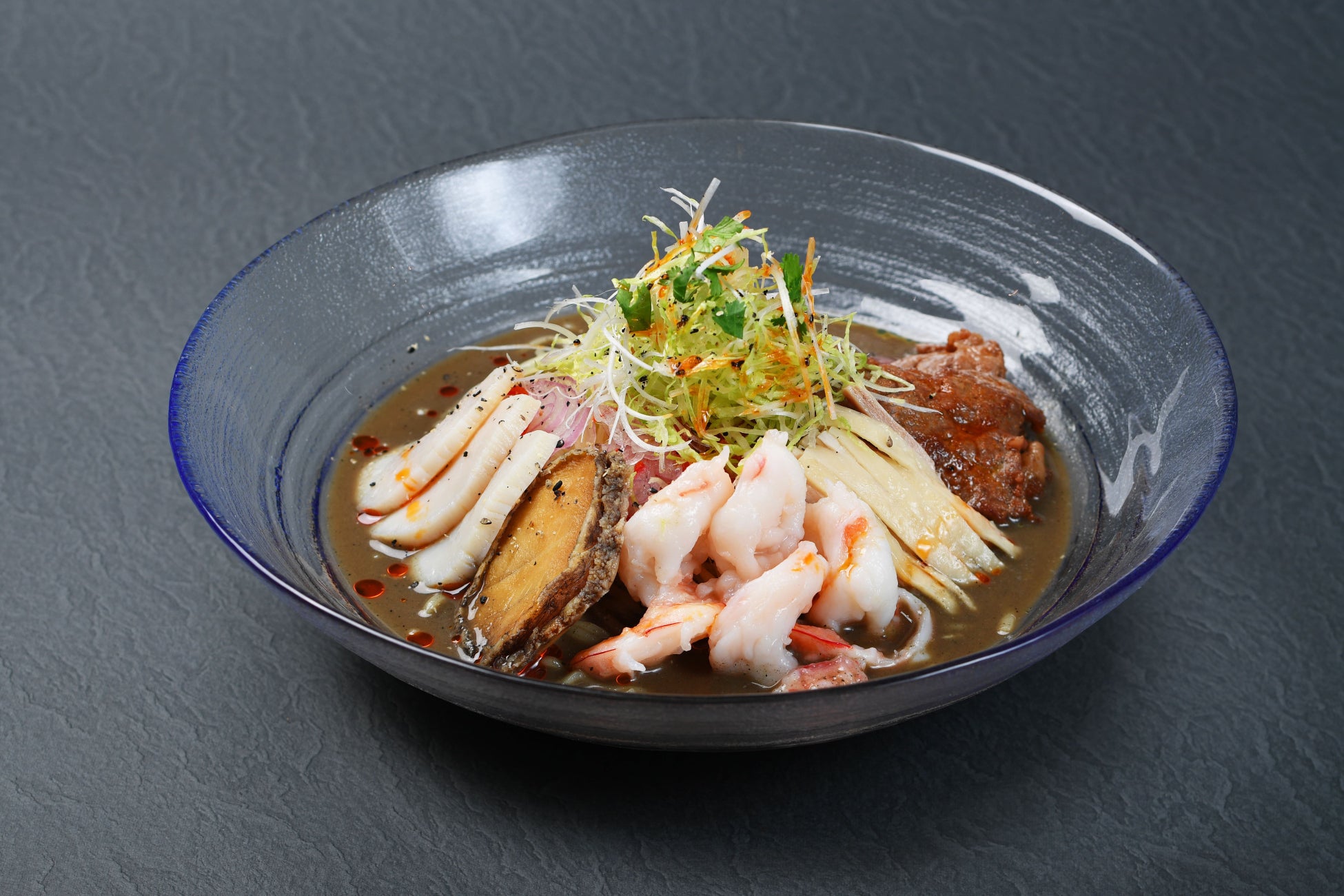 国内有数の雑穀の生産地として知られる、岩手県軽米町の全8種類の雑穀を独自のブレンドで配合した、ホテルオリジナル八穀米「Jシリアル」を練り込んだ麺「Jシリアル麺」を使用。食物繊維やたんぱく質、ビタミン、ミネラル、ポリフェノールなどの栄養価をたっぷり含む麺に、辛味のアクセントとなる“山椒”が効いた濃厚なブラックスープをすっきりとした味わいに仕上げた、定番人気の一品です。