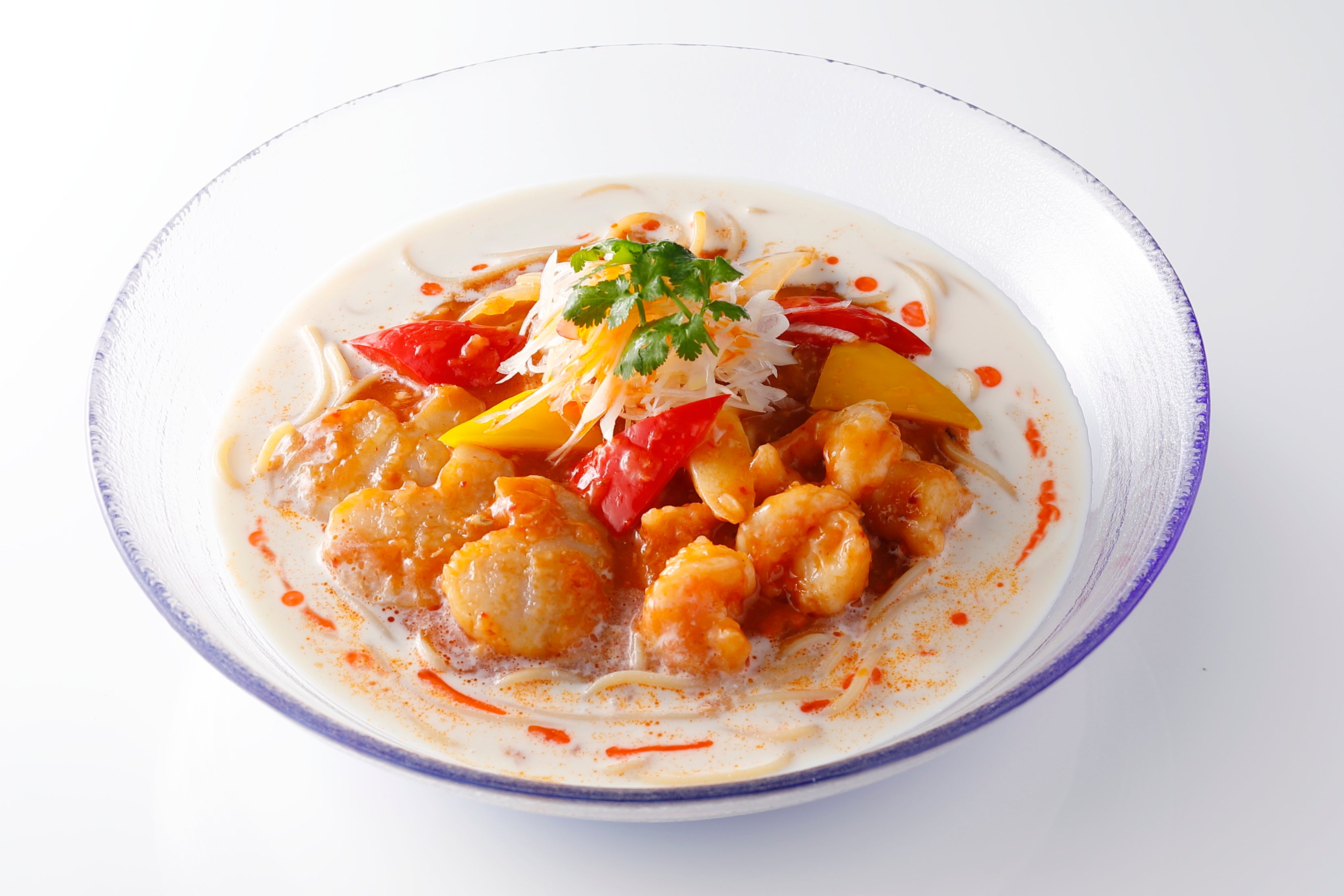 黄えんどう豆100%の「ゼンブヌードル」に、野菜出汁と豆乳で仕上げた特製スープを合わせ、ピリ辛の餡とおおぶりの海老、平貝をトッピングしたヘルシーな一皿。