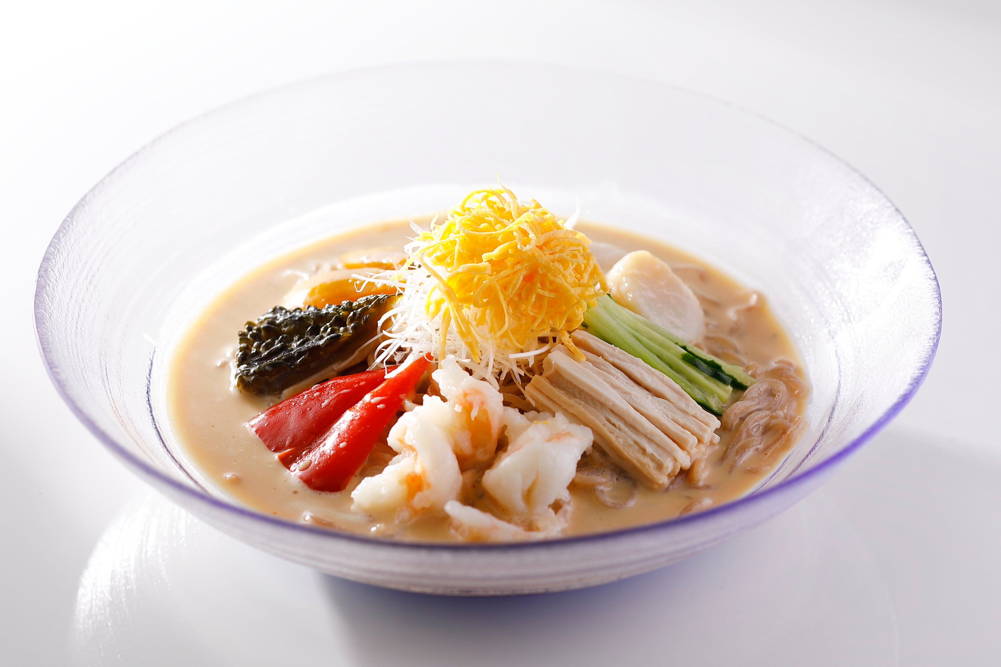 ふかひれを贅沢にトッピングした、ごちそう冷麺がこの夏新作で登場。3種の酢をブレンドした、まろやかな醤油ベースのスープに、ぷるんとしたふかひれと、上海蟹とズワイ蟹がたっぷりと入った餡をトッピングしました。さっぱりとした甘酢の甘みが麺に絡み合い、極上の味わいを生み出します。