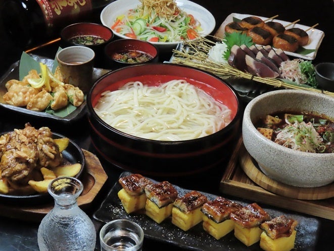 ■新鮮野菜のサラダ ■鰹のたたき 柚子ポン酢で ■鰻玉子焼き ■パリパリ揚げ餃子 完熟トマトソース ■石焼麻辣 肉豆腐 ■手羽元の黒胡椒焼き ■夏野菜の冷や汁風つけ麺 ■デザート