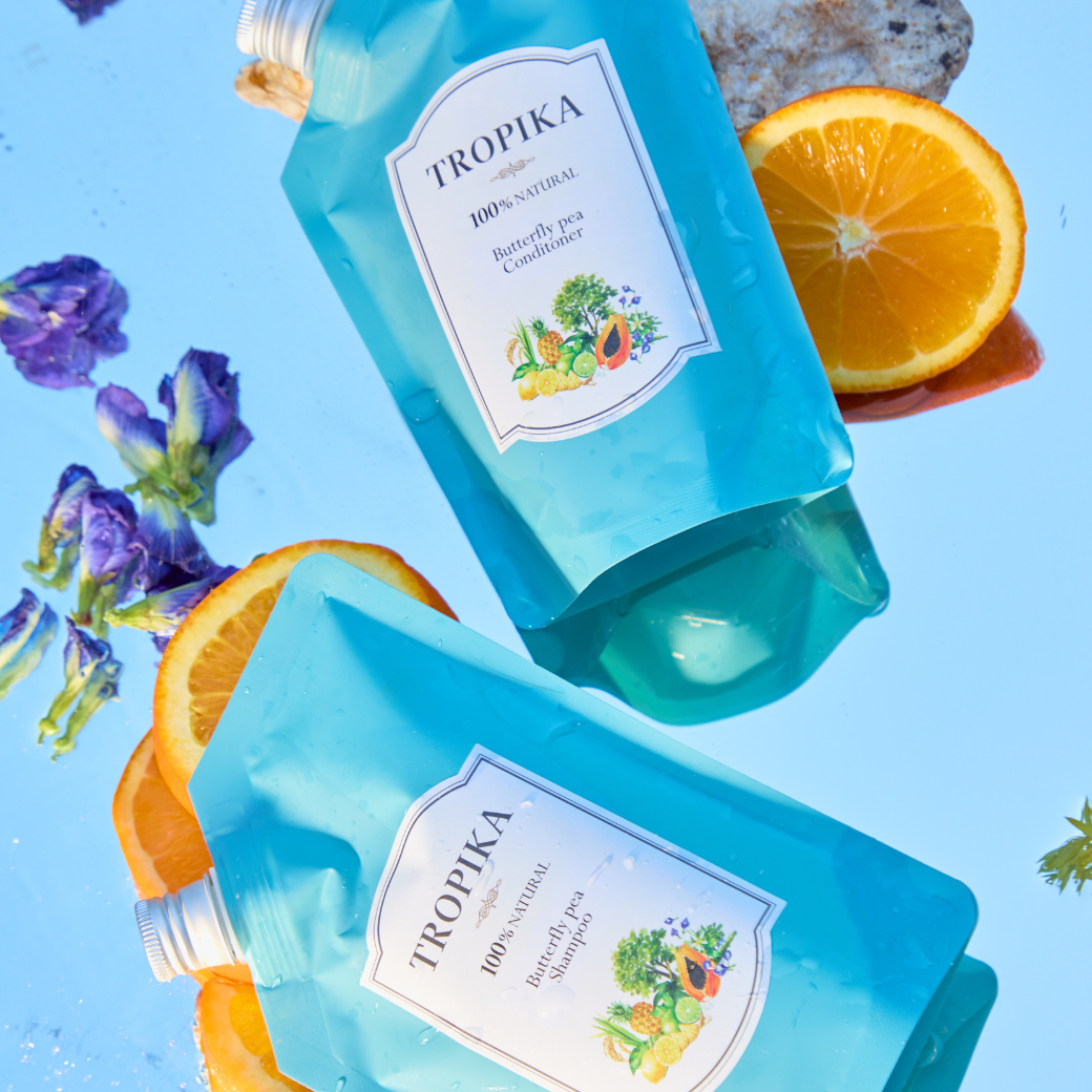ナチュラルさと低刺激(*1)にこだわる「TROPIKA」は、人工香料/着色料、パラベン、アルコール、ミネラルオイルに加えて、合成防腐剤も不使用。原料であるバタフライピーの自然でスッキリとした甘い香りを楽しめます。また、合成防腐剤フリーの為、できる限りフレッシュな状態で使い終われるよう、開封後は3,4か月以内の使用を推奨しており、多くの人が1カ月程度で使い切れる250mlを1パックの容量としています。