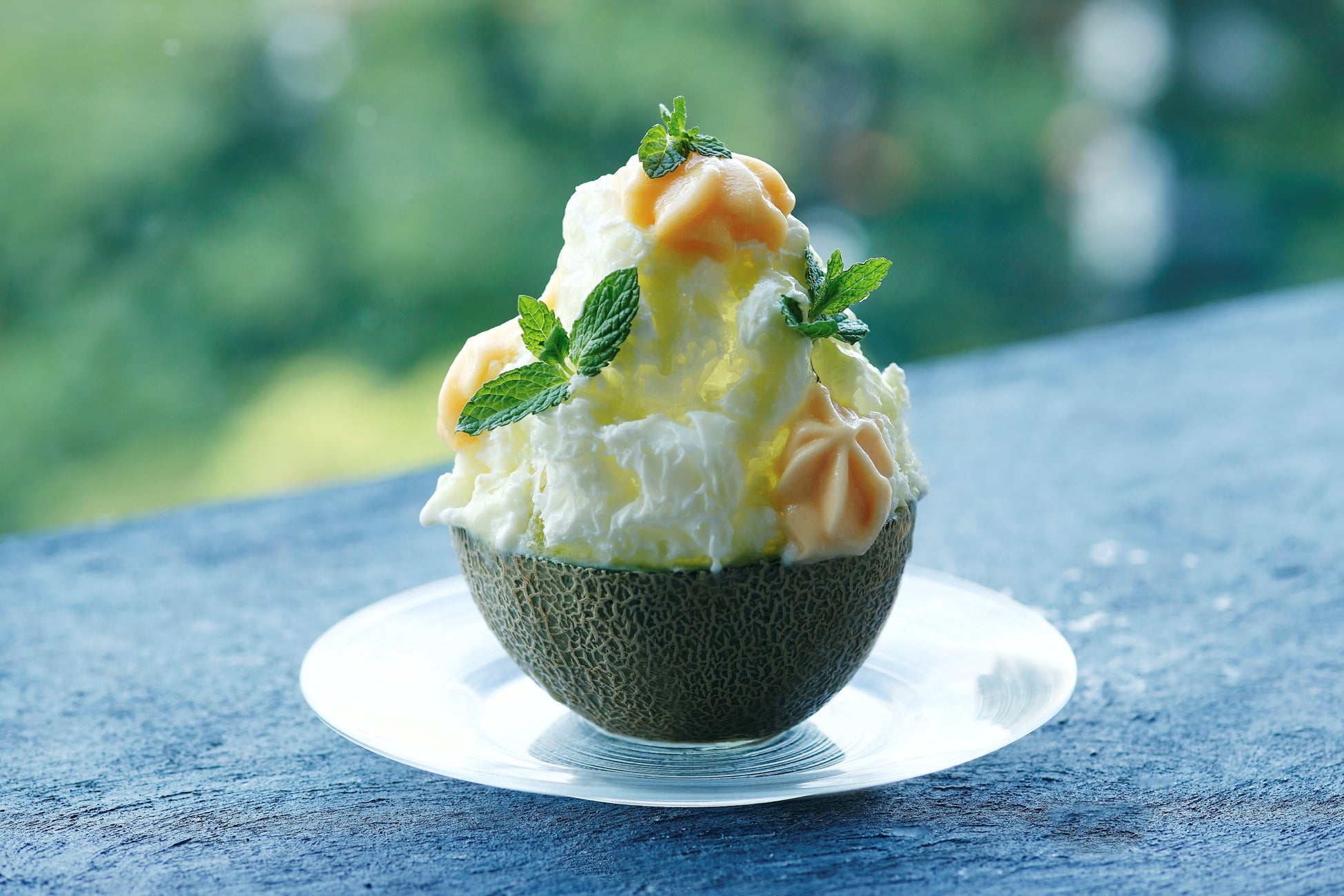 ミルクテイストのシェイブアイスを、メロン半玉の器にふんわりと盛り付け、青肉メロンのシロップと赤肉メロンのエスプーマで仕上げました。