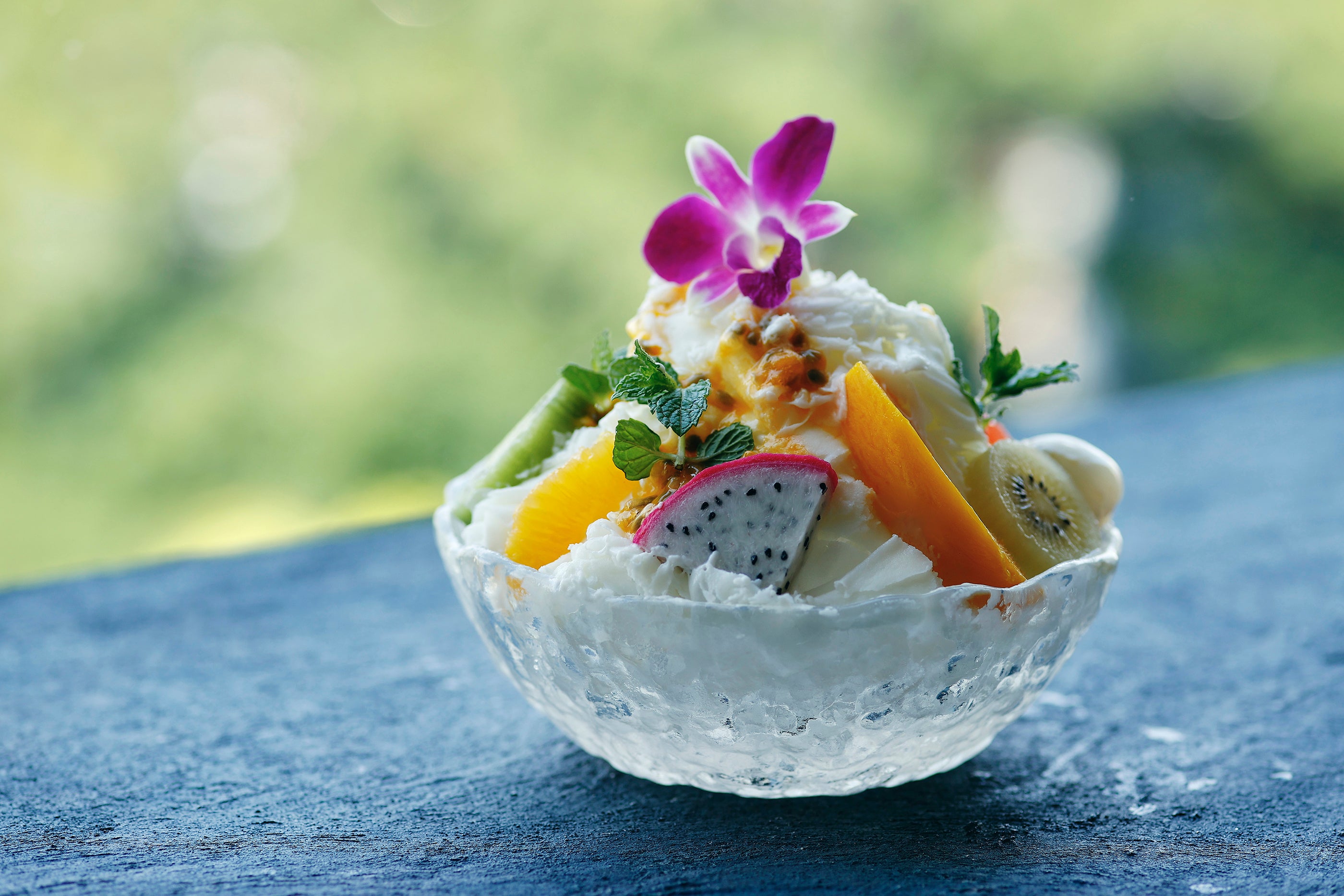 パイナップル、ライチ、マンゴー、パパイヤなど、夏を彩る10種のトロピカルフルーツを、淡雪のようにふわふわなシェイブアイスにトッピングしました。