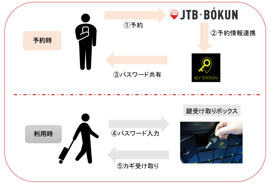 今回のシステム連携により、『JTB BÓKUN』の予約情報がリアルタイムで『KEY STATION』に反映されるようになります。予約後、『KEYSTATION』から利用者に対し、自動的にカギ受け取り用のパスワードが発行されるので効率的な運営が可能となります。