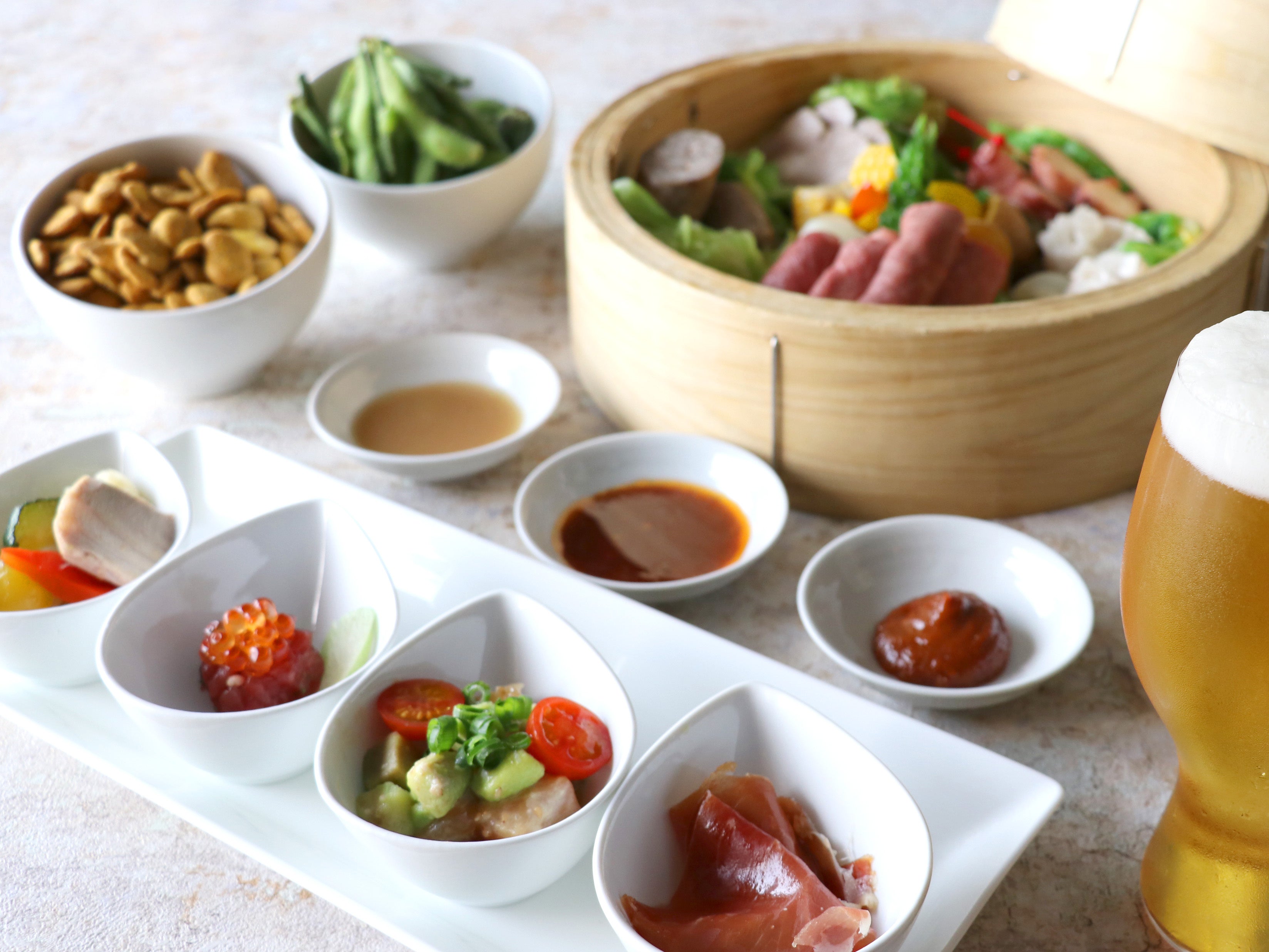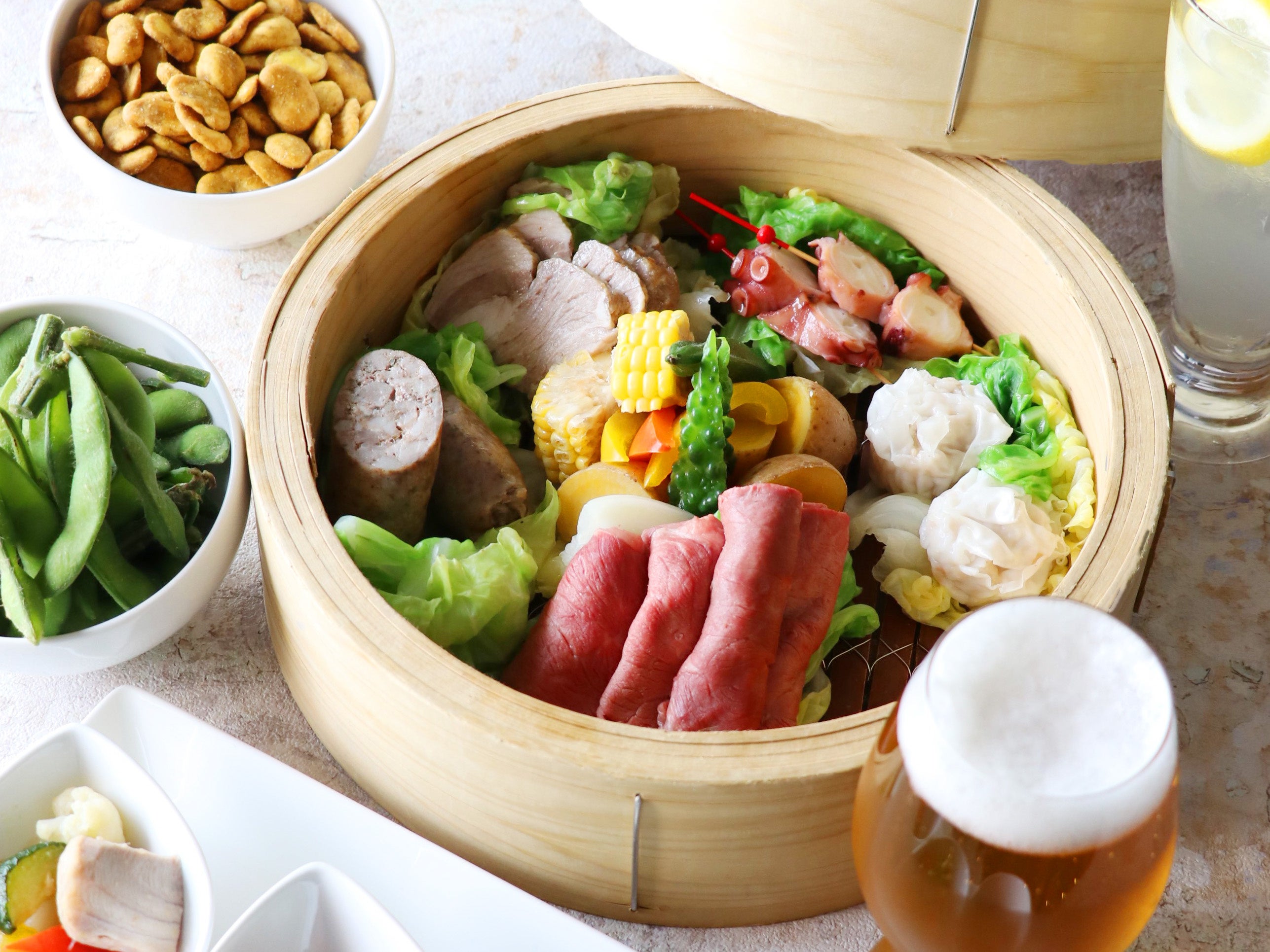 料理は、温かいものは温かいまま召し上がることができるよう、せいろでご提供いたします。ふたを開けると、湯気の中から黒毛和牛のもも肉やセージ風味の生ソーセージ、ジューシーで食べ応えのある黒豚ばら肉のコンフィ、プリプリとした食感の蛸や海老入り肉焼売のほか、新鮮な野菜の数々が現れます。特製のタレ3種からお好みの味でご賞味ください。