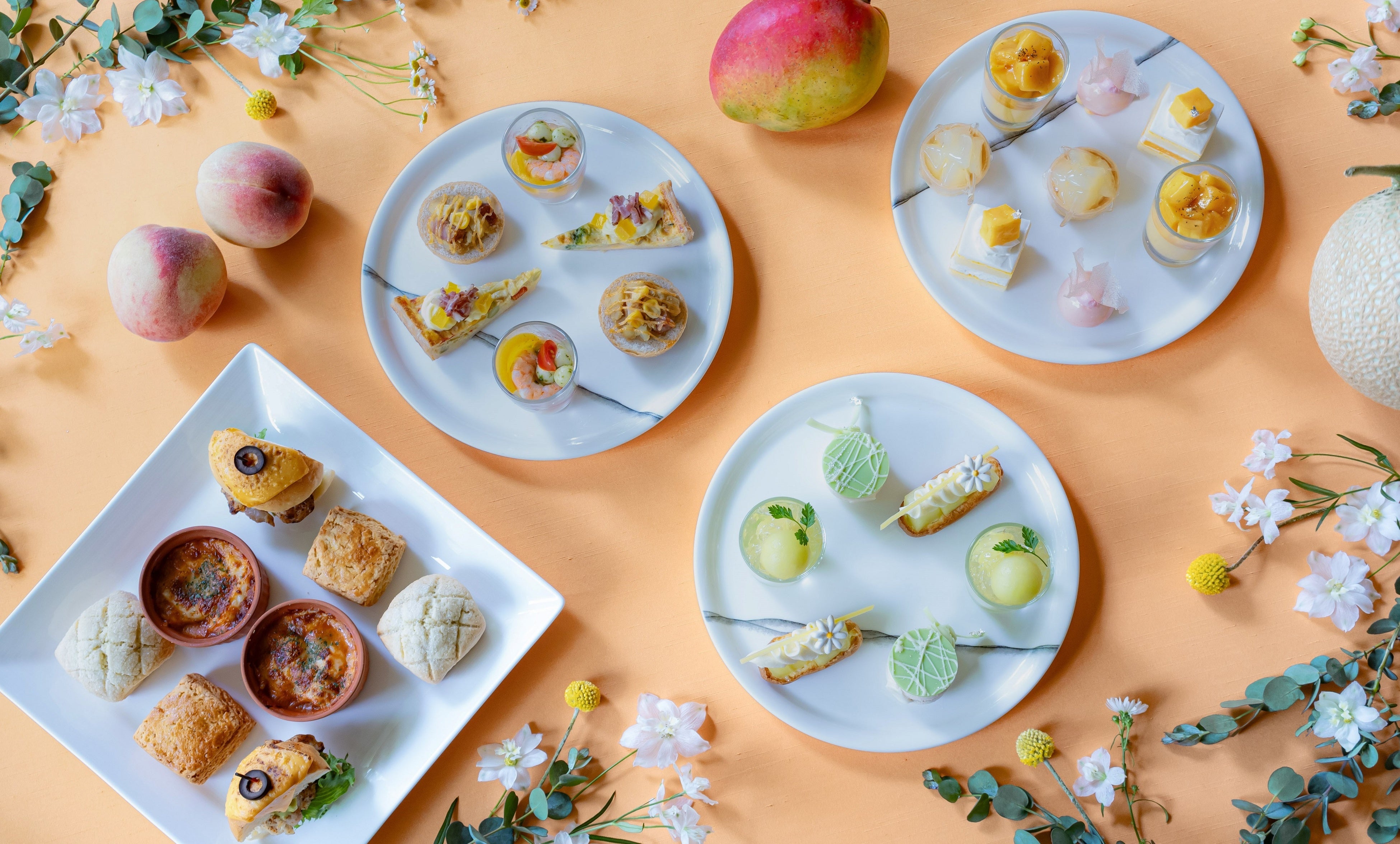 メロンソースにノンアルコールの白ワインゼリーと果汁たっぷりのメロンの果肉を乗せたメロンヴェリーヌや、芳醇なマンゴーの香りが引き立つショートケーキ、桃の甘さとヨーグルトクリームの酸味が爽やかな桃のタルトのほか、セイボリーでは黒胡椒がアクセントのマンゴークリームチーズとパストラミのキッシュや海老と桃のカプレーゼ 夏野菜ジュレ仕立てをご用意し、フルーツ尽くしで甘く華やかに夏を楽しむひとときをご堪能いただけます。