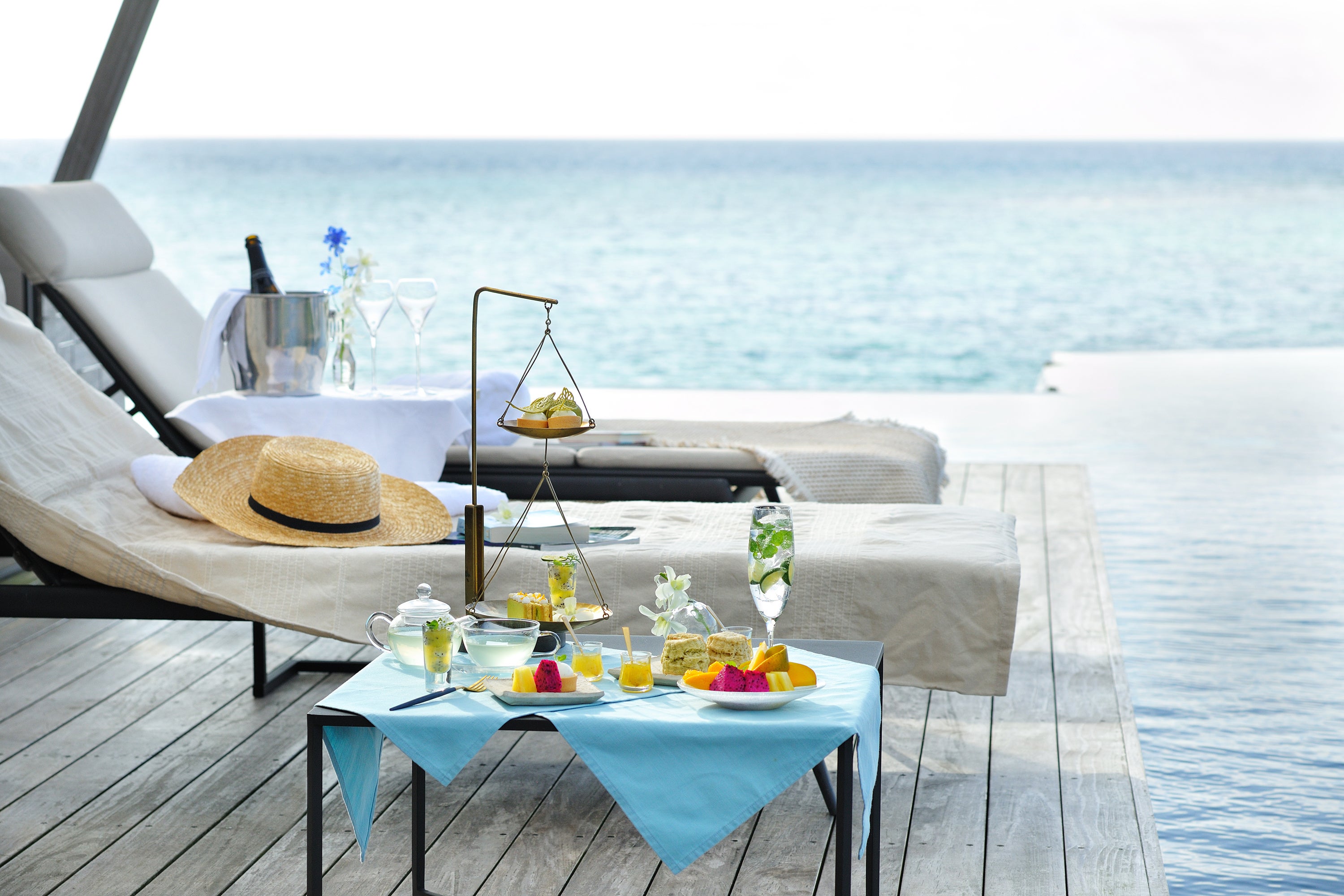 海に臨むプールサイドで、爽やかな⾵を感じながら楽しむティータイム