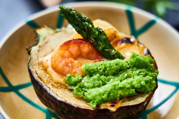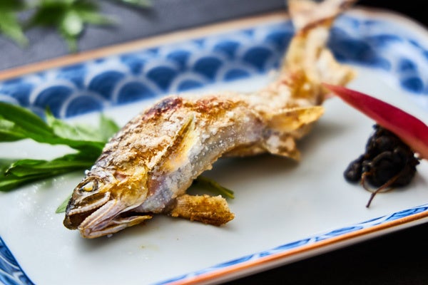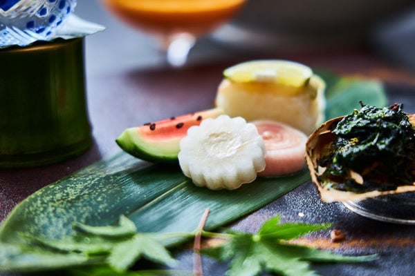 前菜では旬の肉厚の鮑に肝ソースをたっぷり絡めて食べる“鮑磯焼き”や、生ハムを渦のように巻いた“生ハム鳴門”、瓜をすいかのように仕上げた“すいか小メロン”など、旬の味を楽しめるだけでなく、夏らしいものに見立てた視覚的にも楽しい品々を揃えました。また、氷細工の器にお造りを盛り付けた“氷室盛り”は見た目も涼やかな一品です。焼物では、みずみずしく淡白な味わいの中にも甘みがあり、丸ごと食べられる最盛期の鮎を塩焼きにしてご提供いたします。強肴は旬の丸茄子に田楽味噌を塗り、さらに味噌とチーズを合わせた同じく旬のずんだをのせて焼き上げました。夏の食材をさまざまな調理法でお楽しみいただける会席料理です。