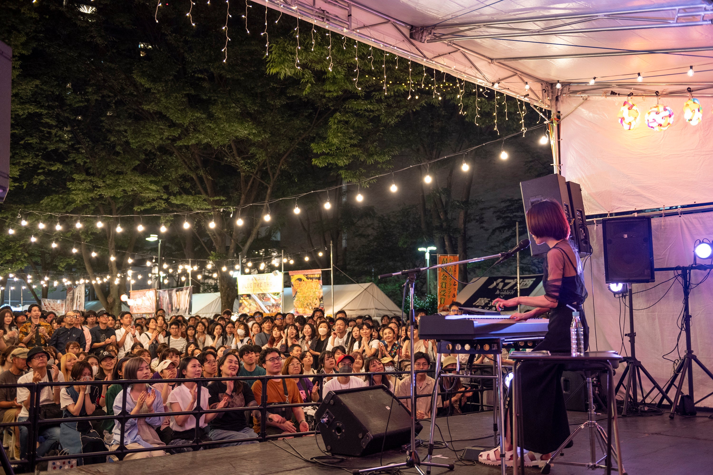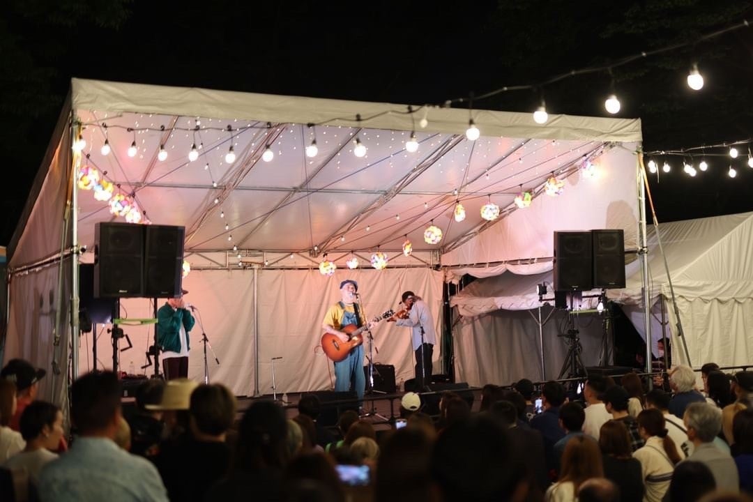 いよいよ終着点、ライブステージにたどり着くと、若手からベテランまでジャンルを超えたアーティストラインナップが観客たちをイベント終着点で迎え入れ、前川慎吾(かりゆし58)による特別編成や、「民謡ユニット こでらんに〜」によるステージでは、アーティストの呼びかけにより盆踊りのサークルが生まれ、海外ツーリストも「日本の祭り」を楽しんだ。